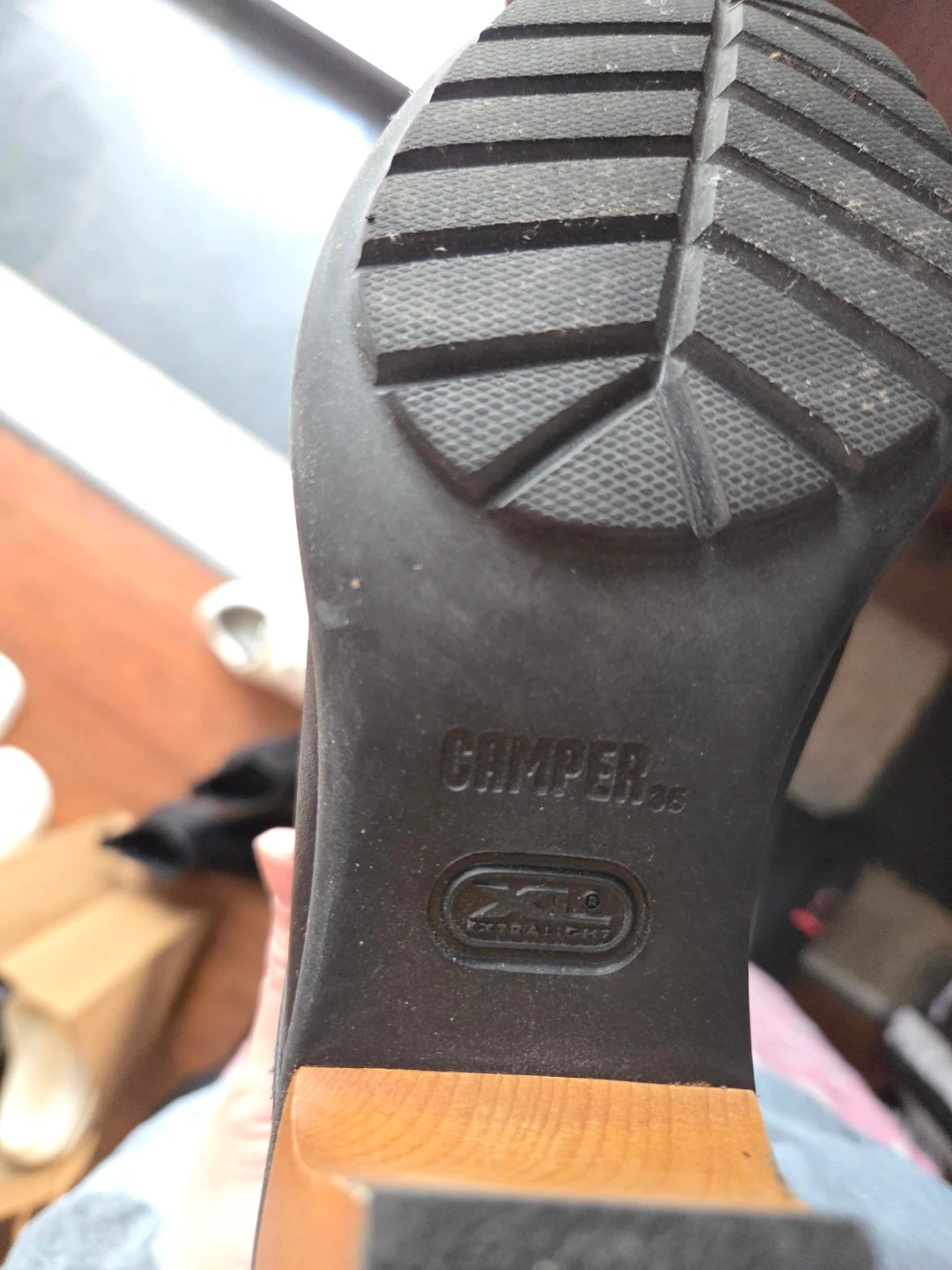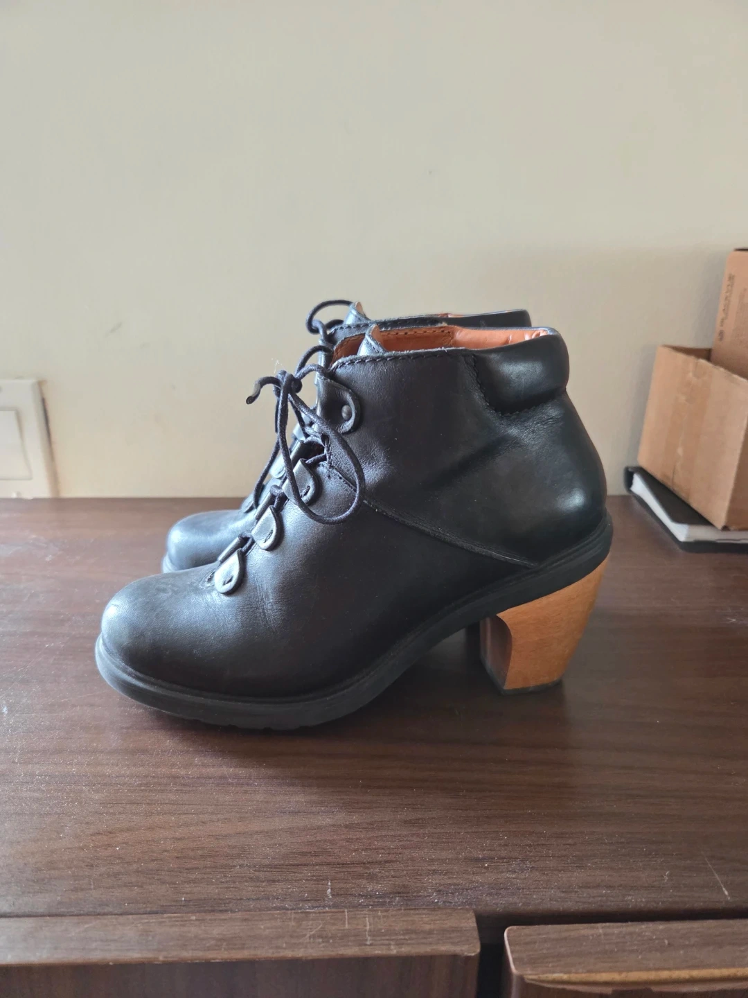 These black leather ankle boots from Camper feature a lace-up front and a unique wooden block heel. Very comfortable for everyday wear as its extra cushioned! Gently used.