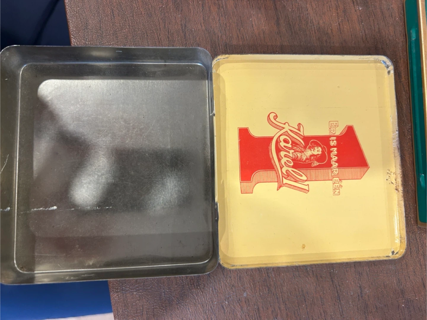 Vintage metal tin for Karel I tobacco. Features a portrait of Karel I and ornate detailing on the exterior. Interior is plain metal. Perfect for storing small items or as a collectible piece!