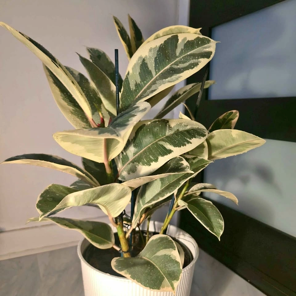 Real Rubber Tree in a 10" nursery pot with a white decorative cover. This plant is 3.4' tall and 2.11' wide, and will continue to grow in this pot. Pick-up in North Vancouver.