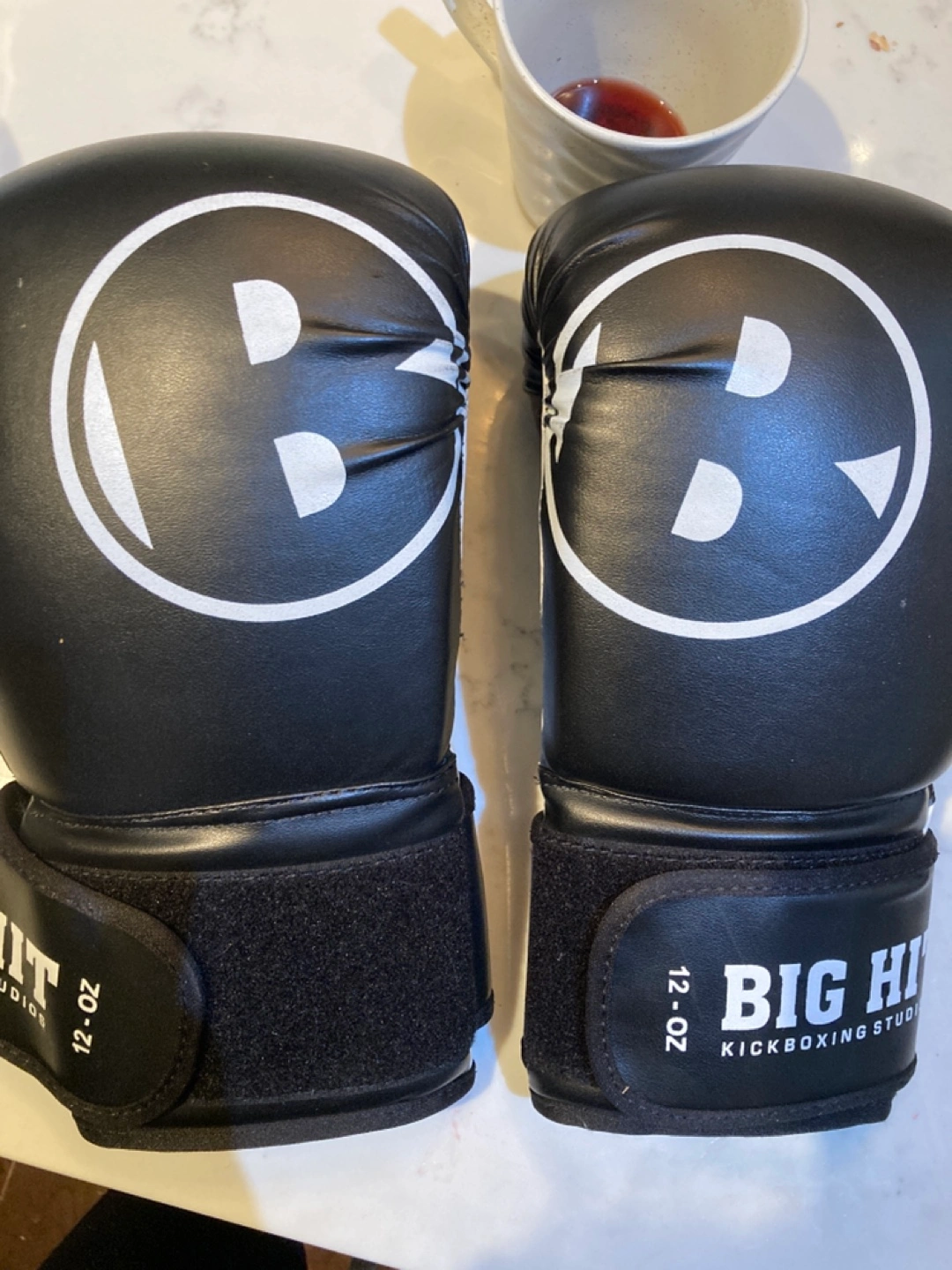 Pair of black boxing gloves. 12 oz. Velcro closure. Big Hit Kickboxing Studio logo.