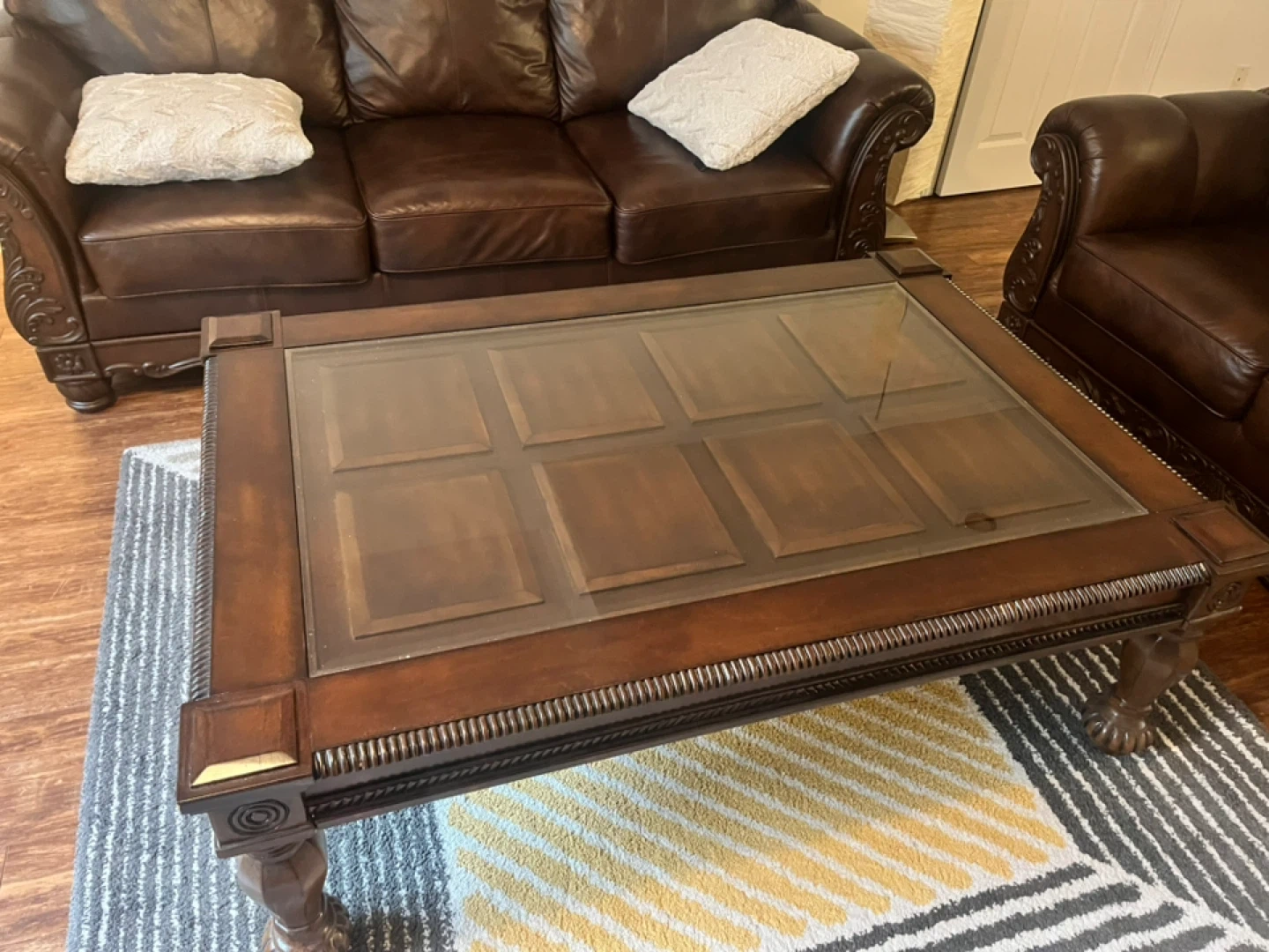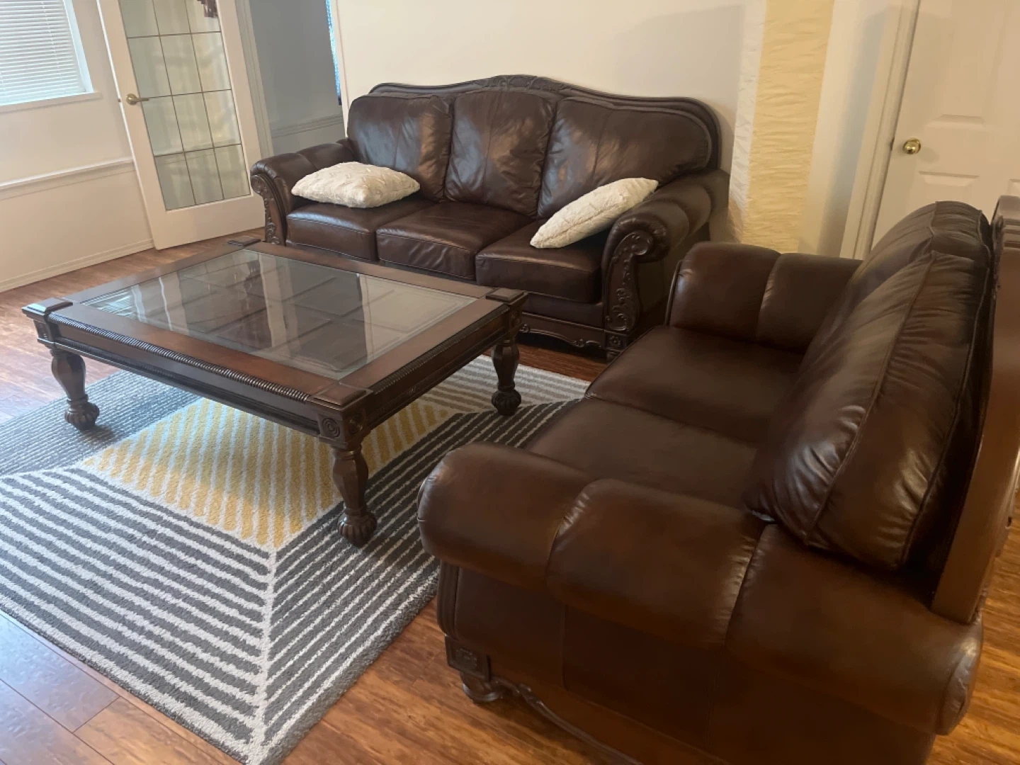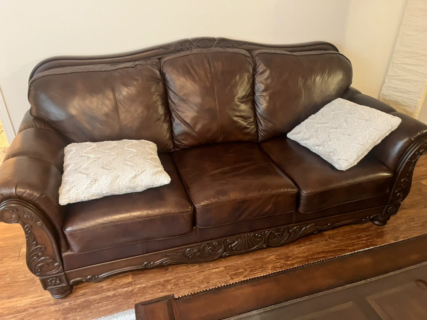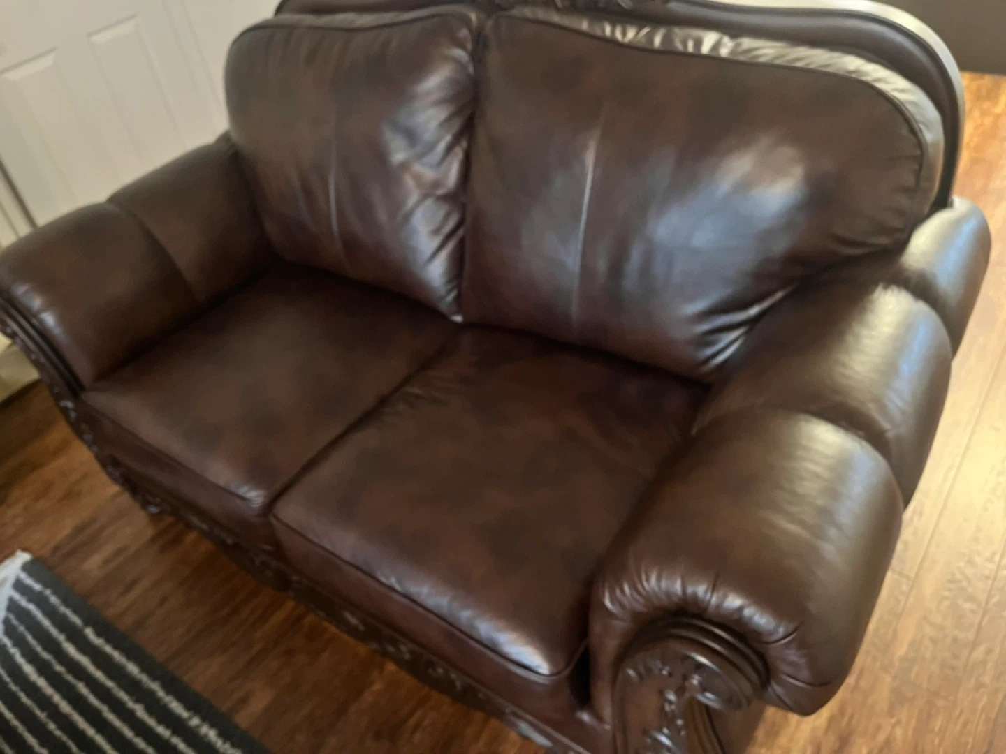 Beautiful dark brown leather sofa set with a timeless, elegant look. Perfect for a living room or formal sitting area. orignal brought $5000+