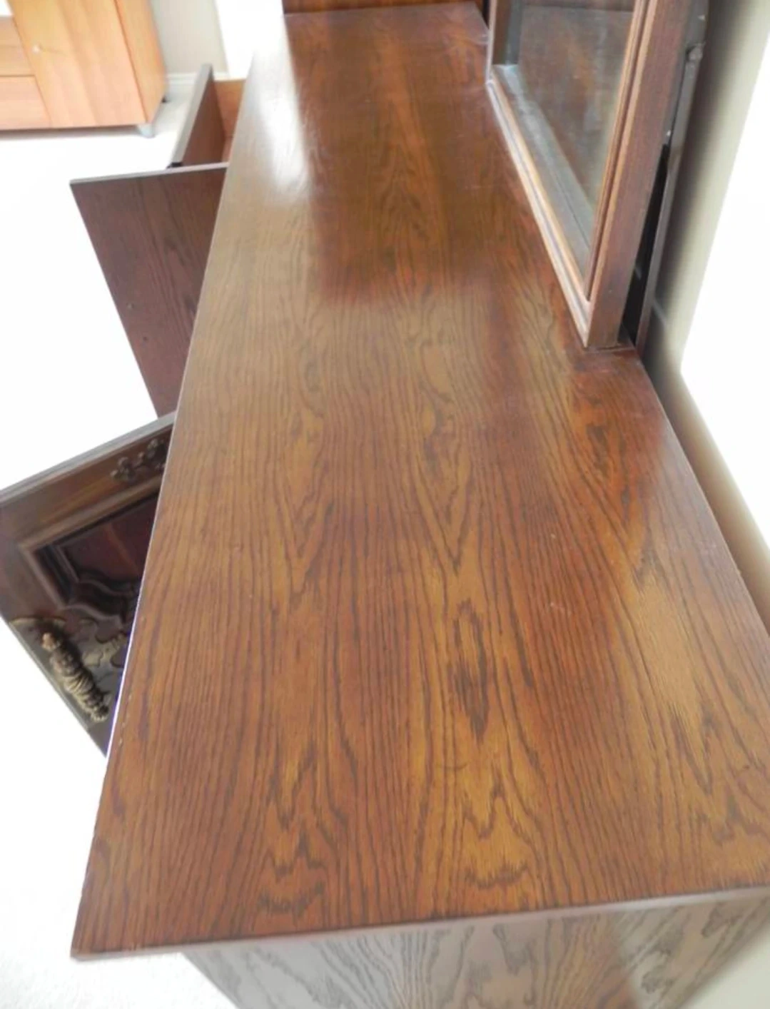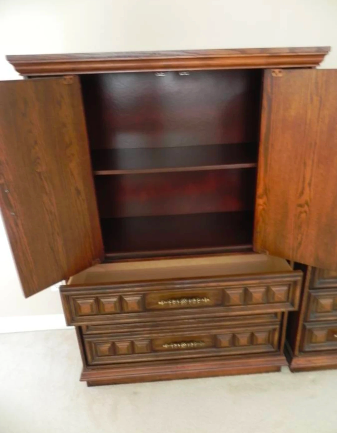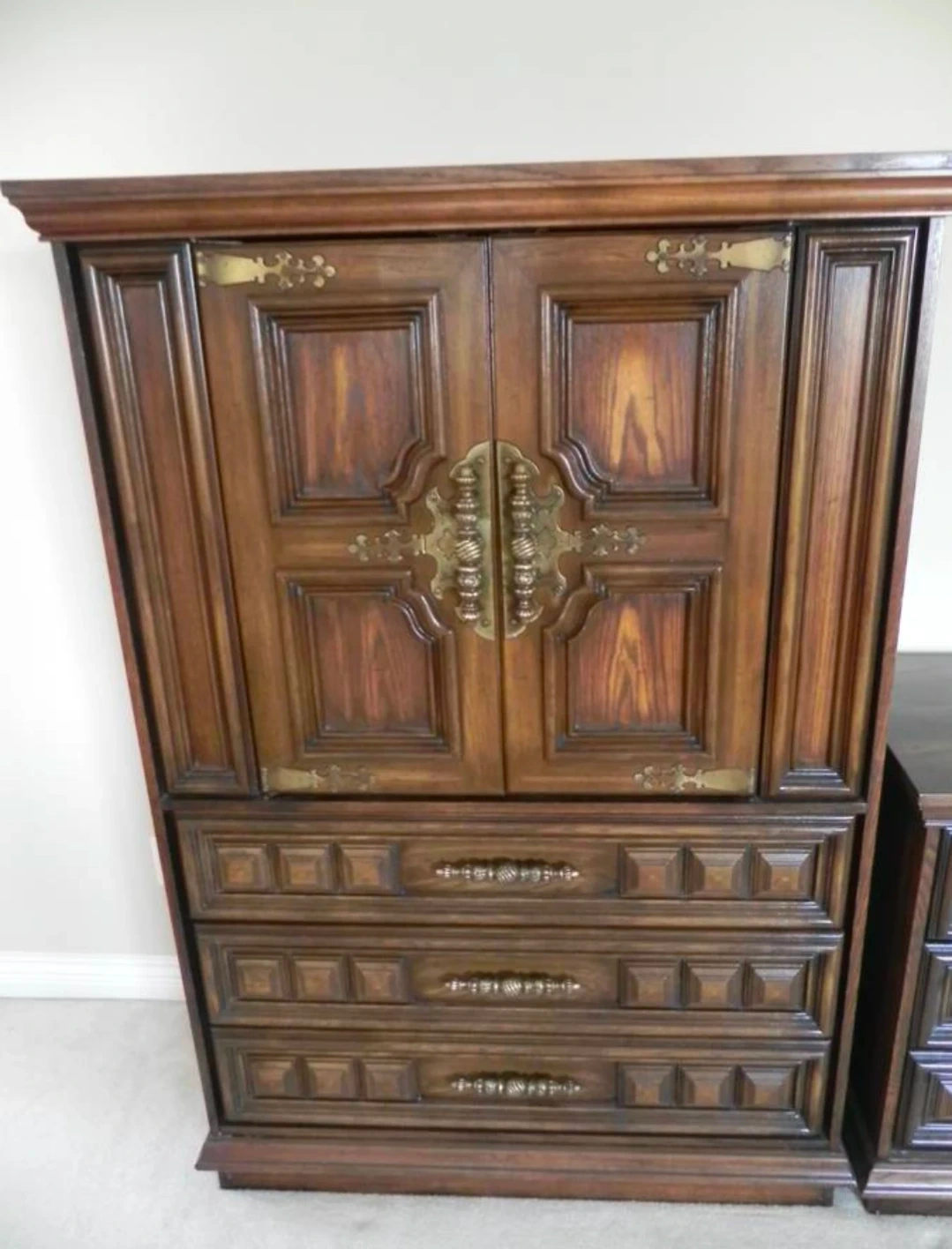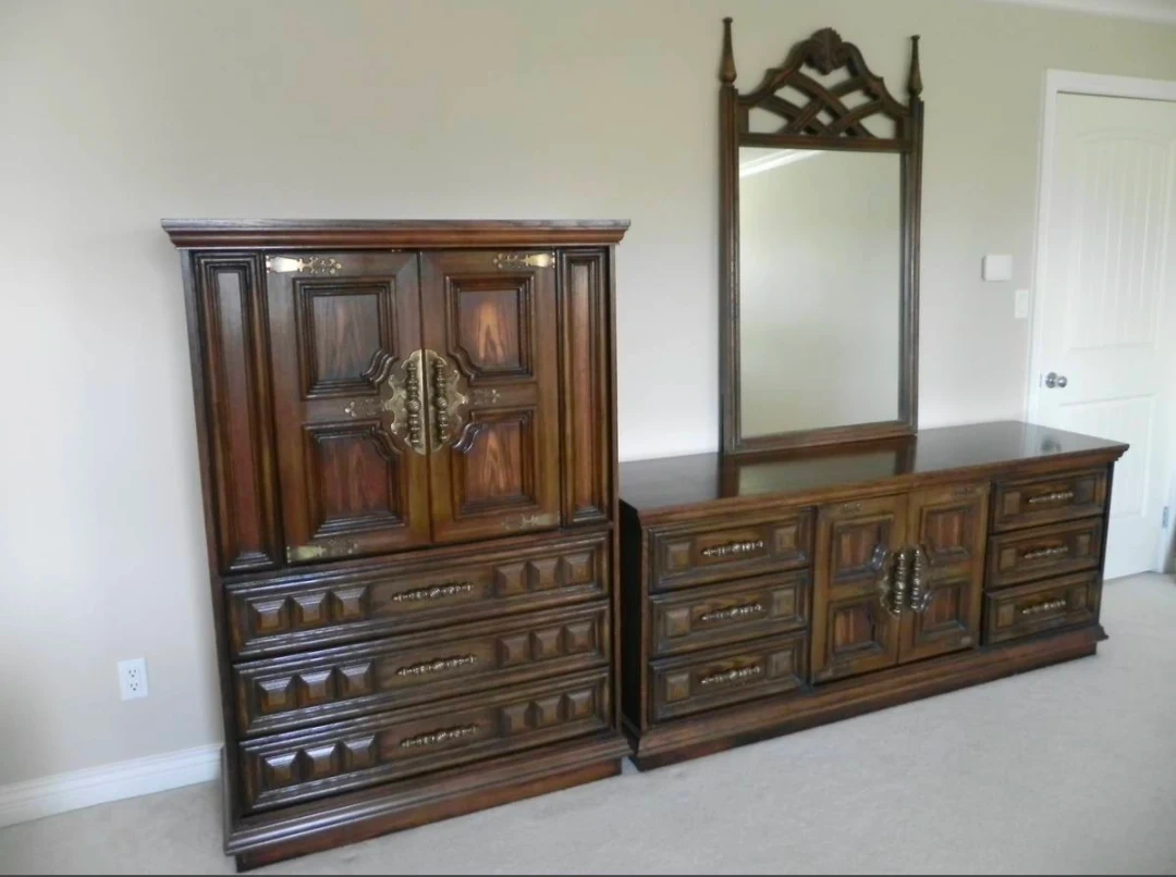 A vintage dresser set made of solid wood with ornate brass hardware. It includes a tall dresser with drawers and cabinet space, and a long dresser with multiple drawers. This set also comes with a matching mirror. Wood material.