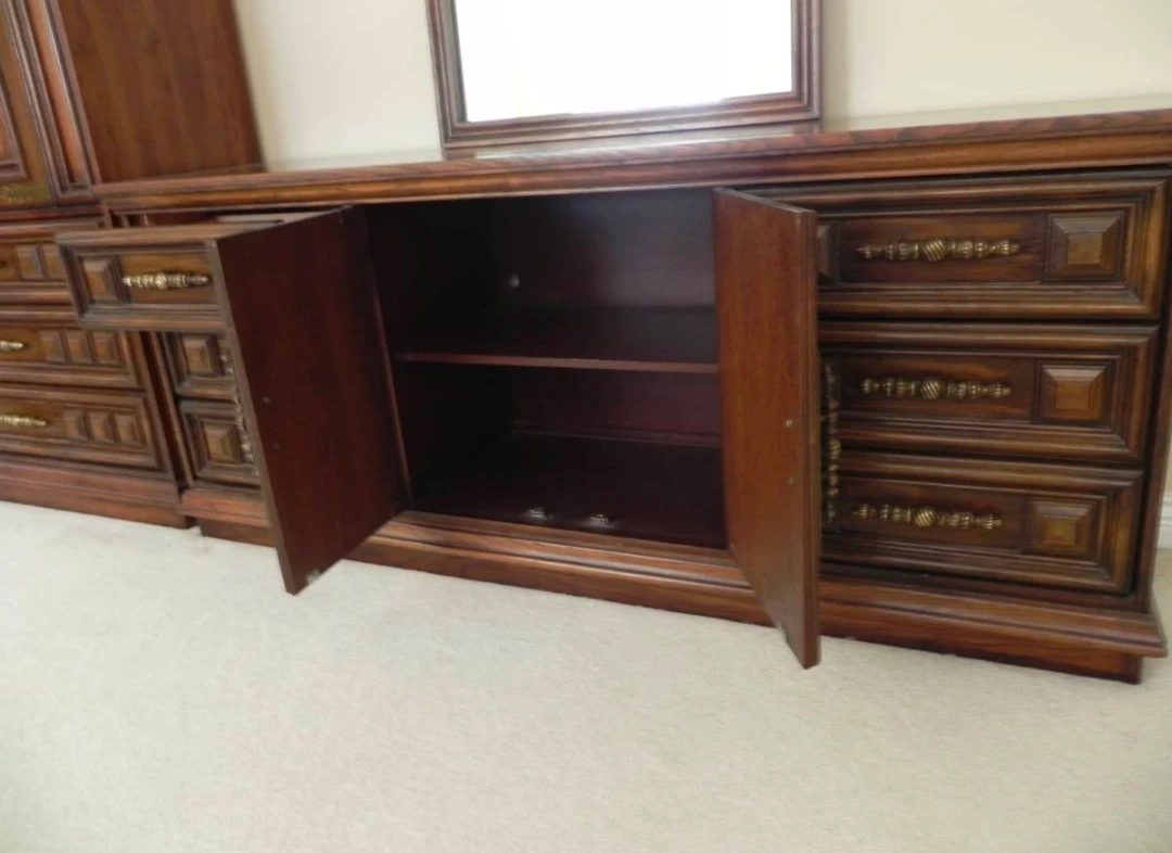 A vintage dresser set made of solid wood with ornate brass hardware. It includes a tall dresser with drawers and cabinet space, and a long dresser with multiple drawers. This set also comes with a matching mirror. Wood material.