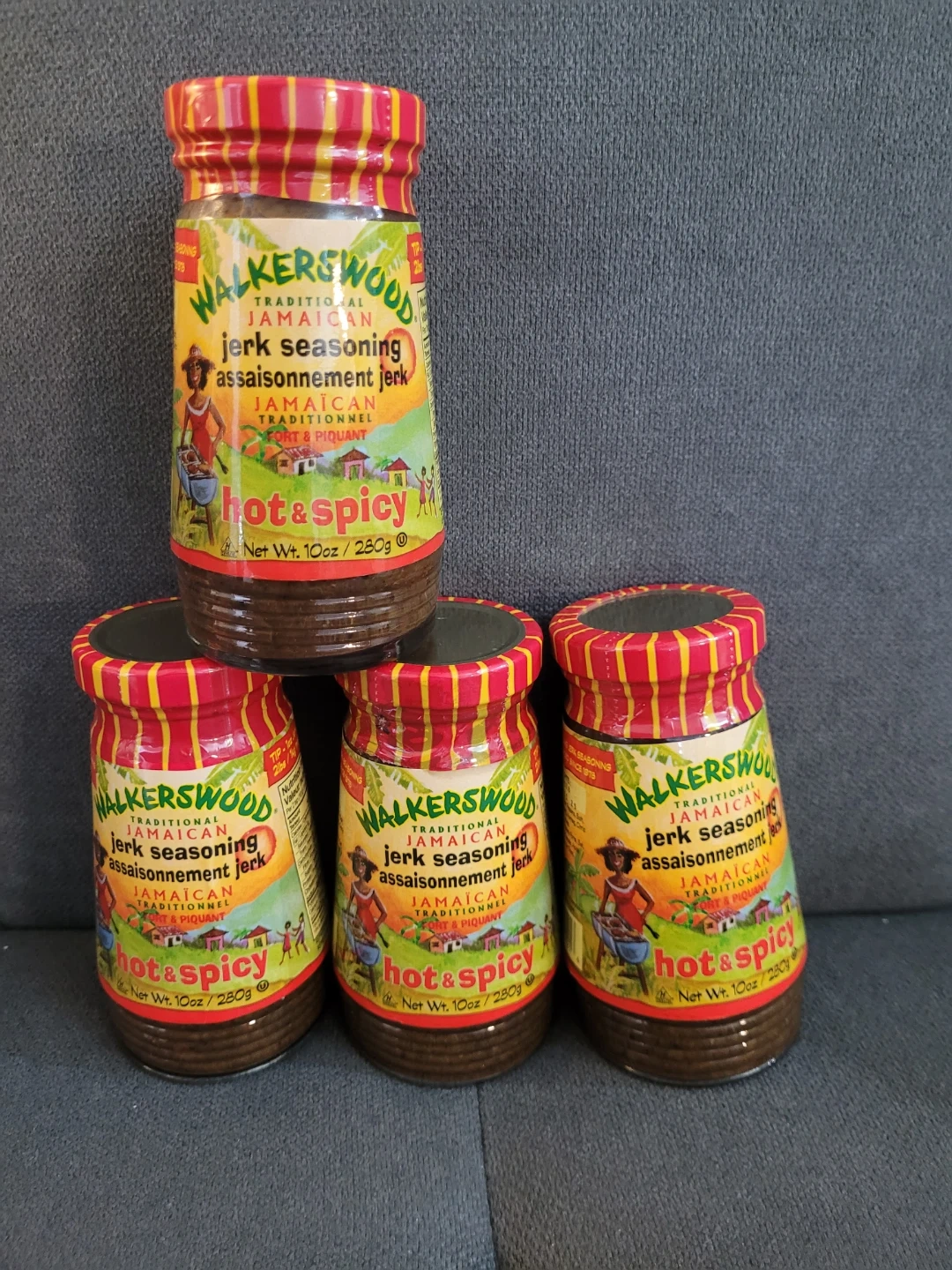 $3 each - Walkerswood Traditional Jamaican Hot & Spicy Jerk Seasoning. Includes four 10oz (280g) jars. This seasoning is traditionally made and features a hot and piquant flavour. It's great for marinades and rubs!
