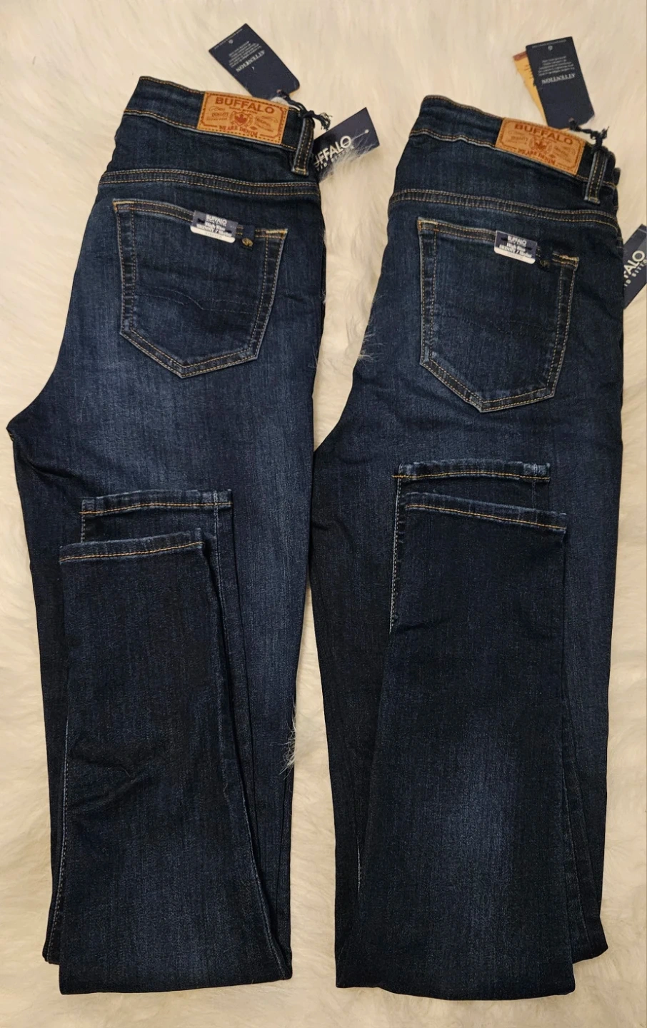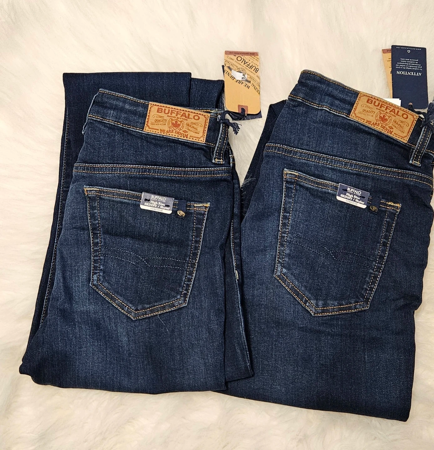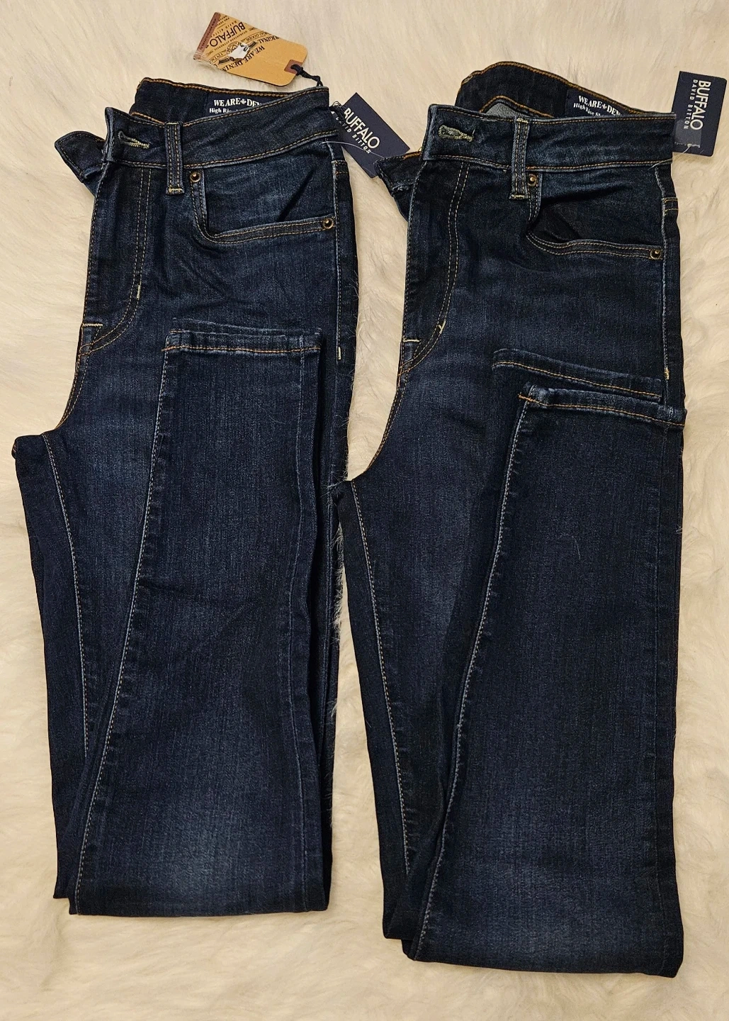 Two pairs of Buffalo Jeans in a dark wash. These are a high-rise, Skinny/Skylar fit style. Made from a durable denim material.