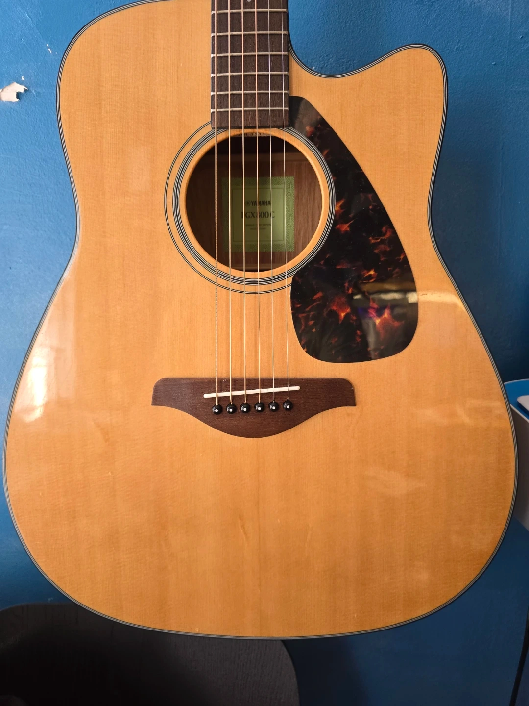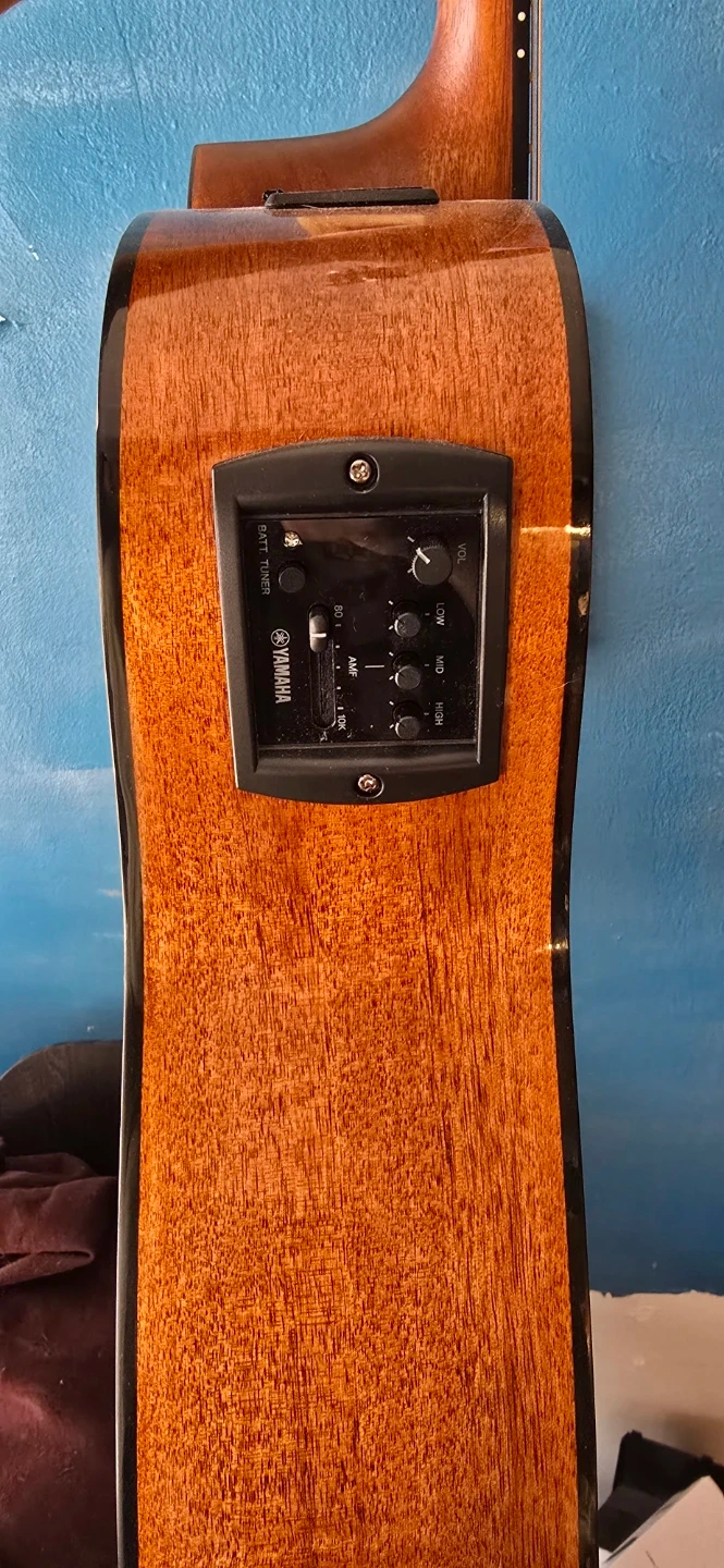 This is a Yamaha FG800C acoustic guitar. It features a dreadnought body with a cutaway for easier access to higher frets. The top is solid spruce, and the back and sides are nato wood. It has a rosewood fingerboard and bridge. This guitar produces a warm and balanced tone.