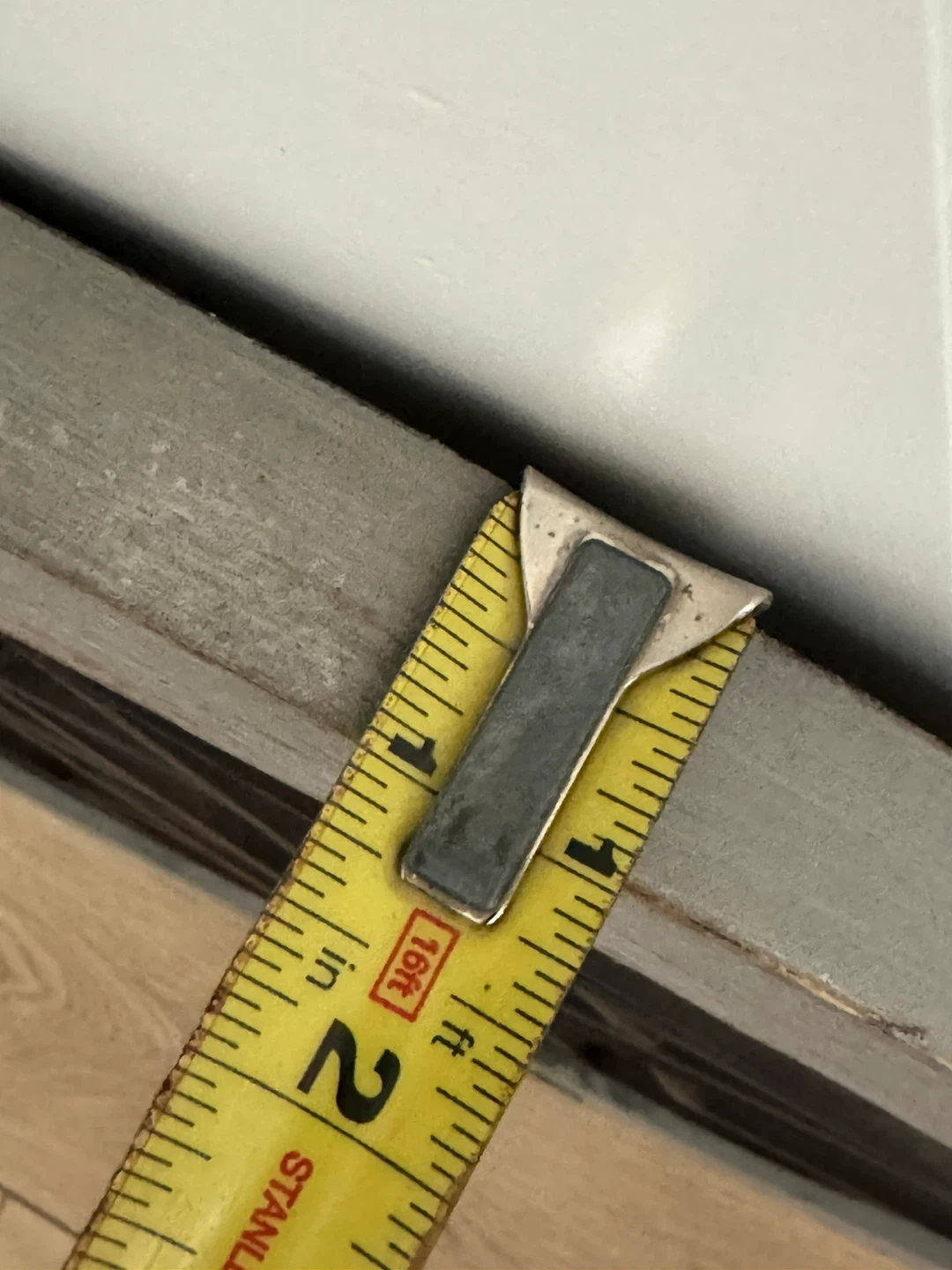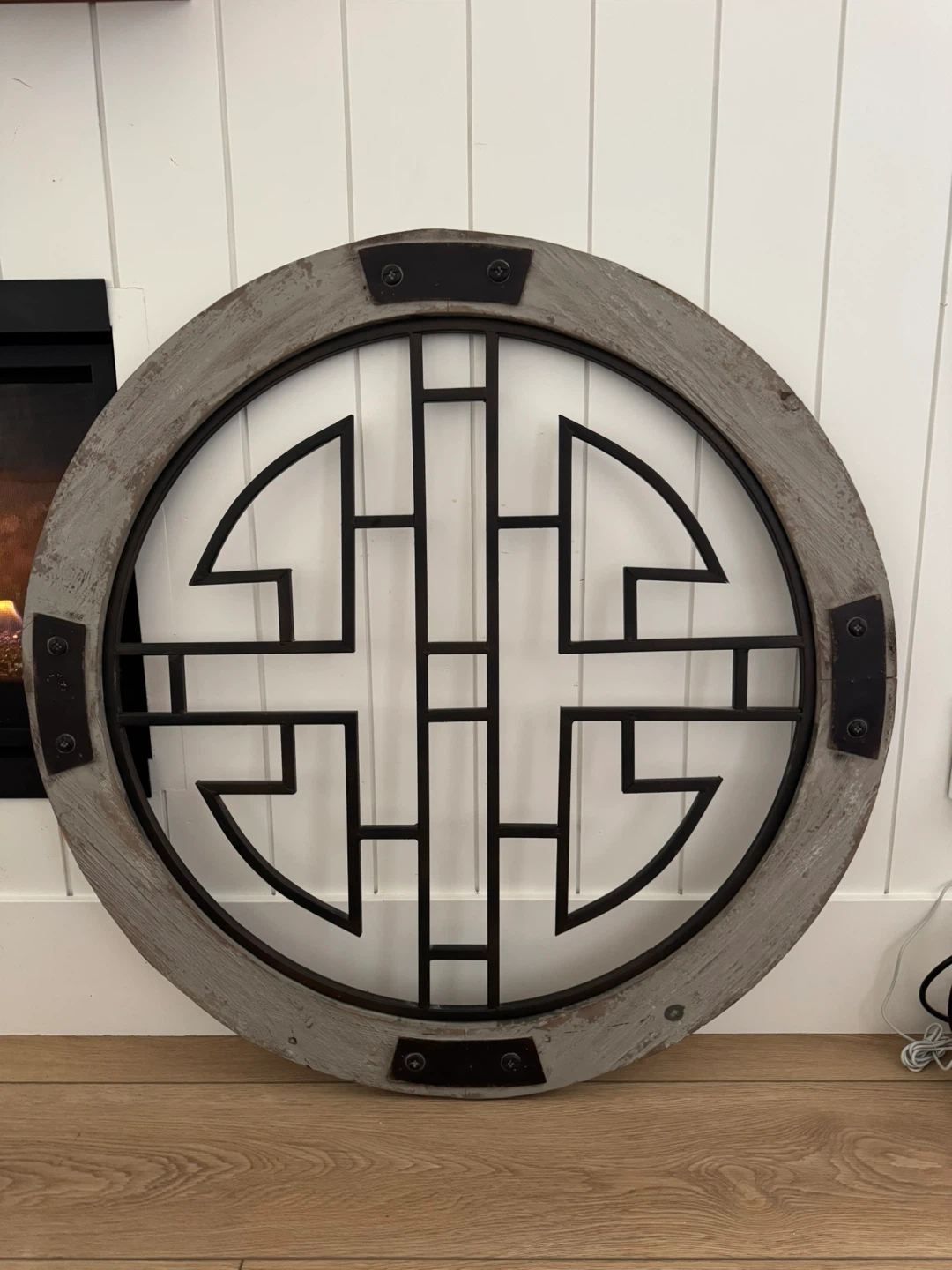 Circular wall art with a distressed grey wood frame and a black metal geometric insert. Looks heavy but is light.