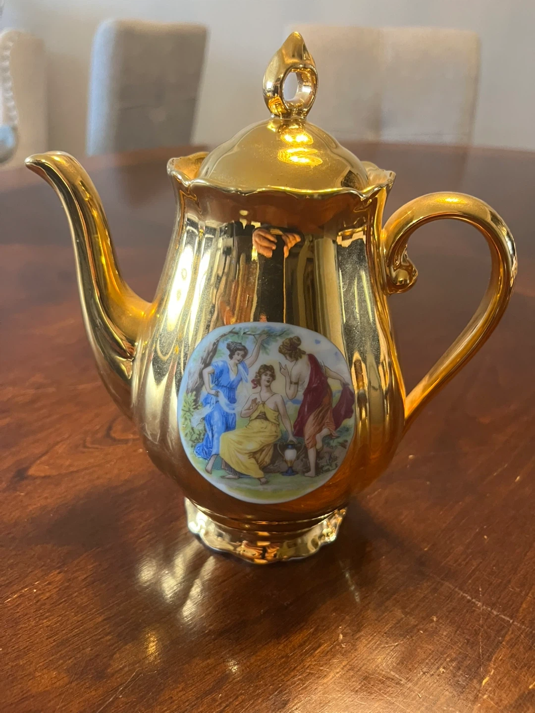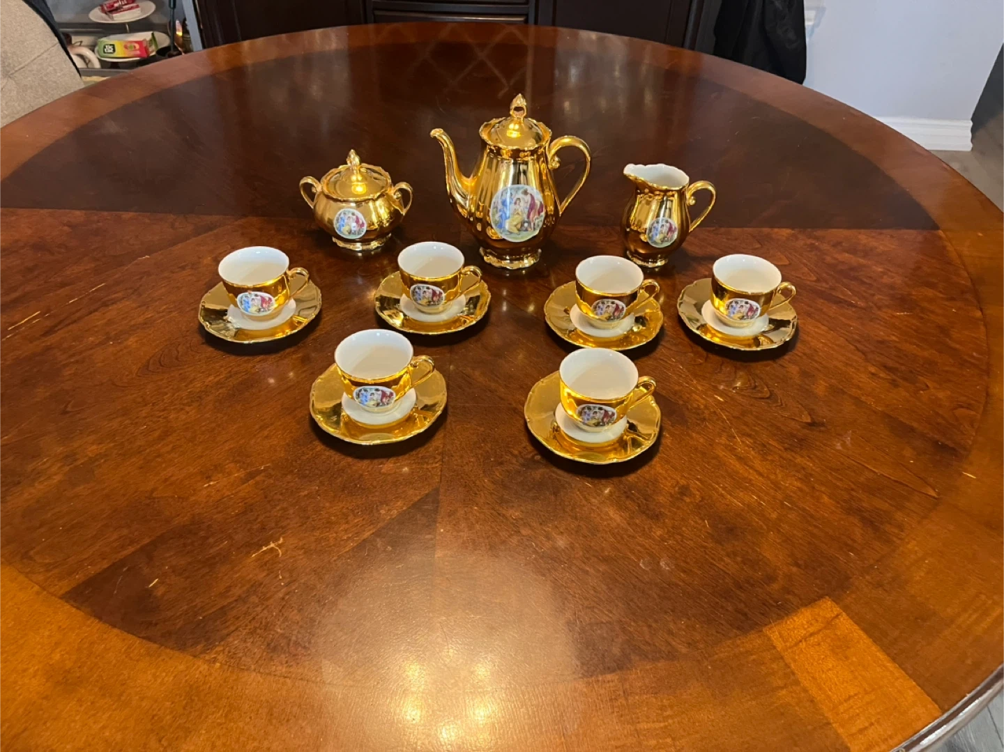 Selling a beautiful gold tea set made by Epiag in Czechoslovakia. The set includes a teapot, sugar bowl, creamer, and 6 cups and saucers. It has a lovely design with figures on each piece. Perfect for adding a touch of elegance to your tea time