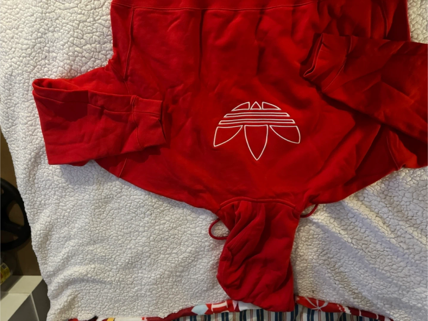 This is a red Adidas hoodie with the Trefoil logo. It's a size XL. The hoodie is made of a comfortable cotton blend. Including adidas 1X women leggings.