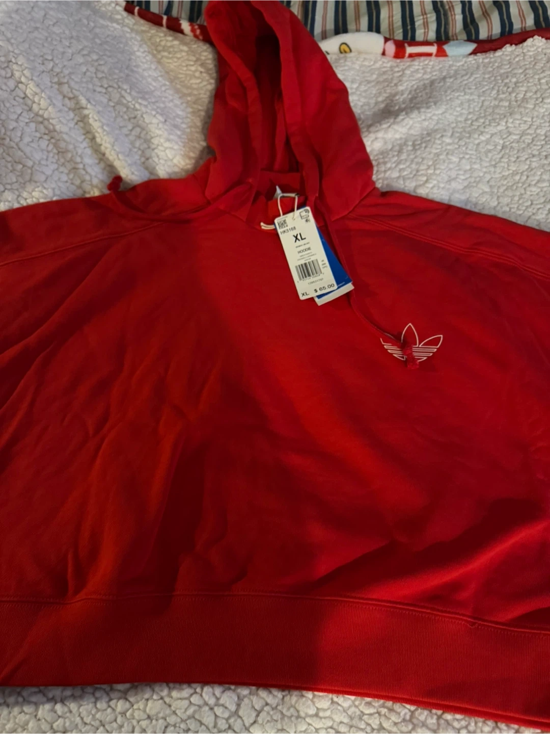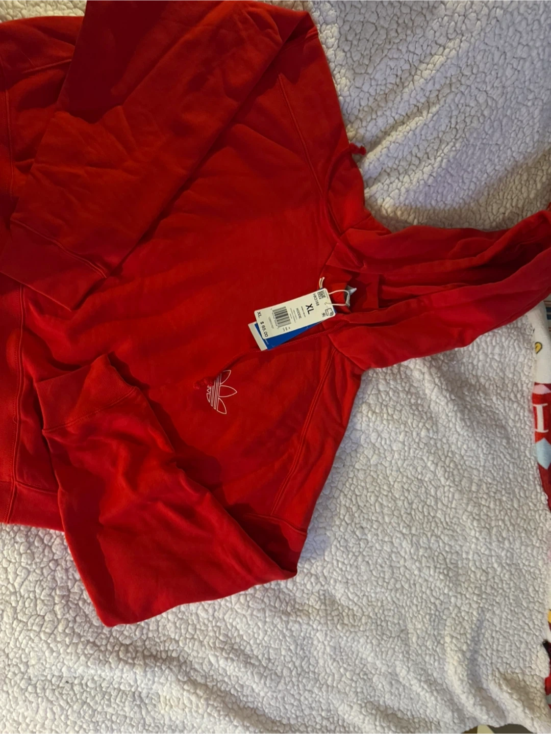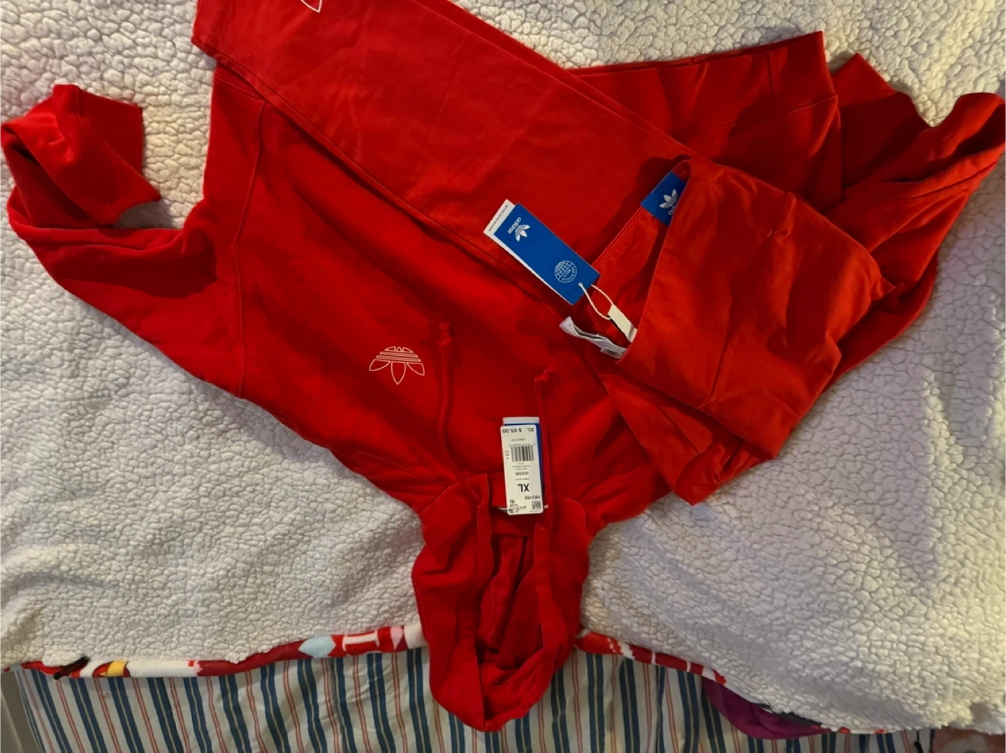 This is a red Adidas hoodie with the Trefoil logo. It's a size XL. The hoodie is made of a comfortable cotton blend. Including adidas 1X women leggings.