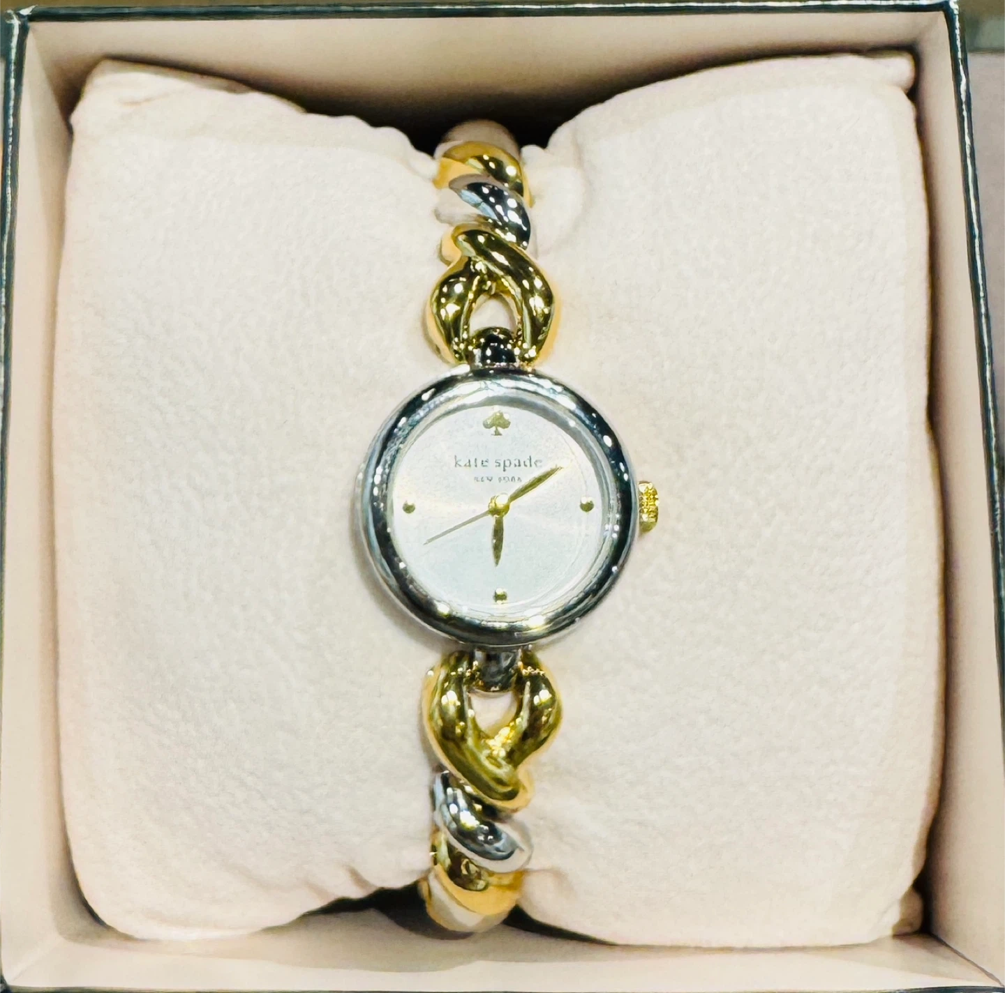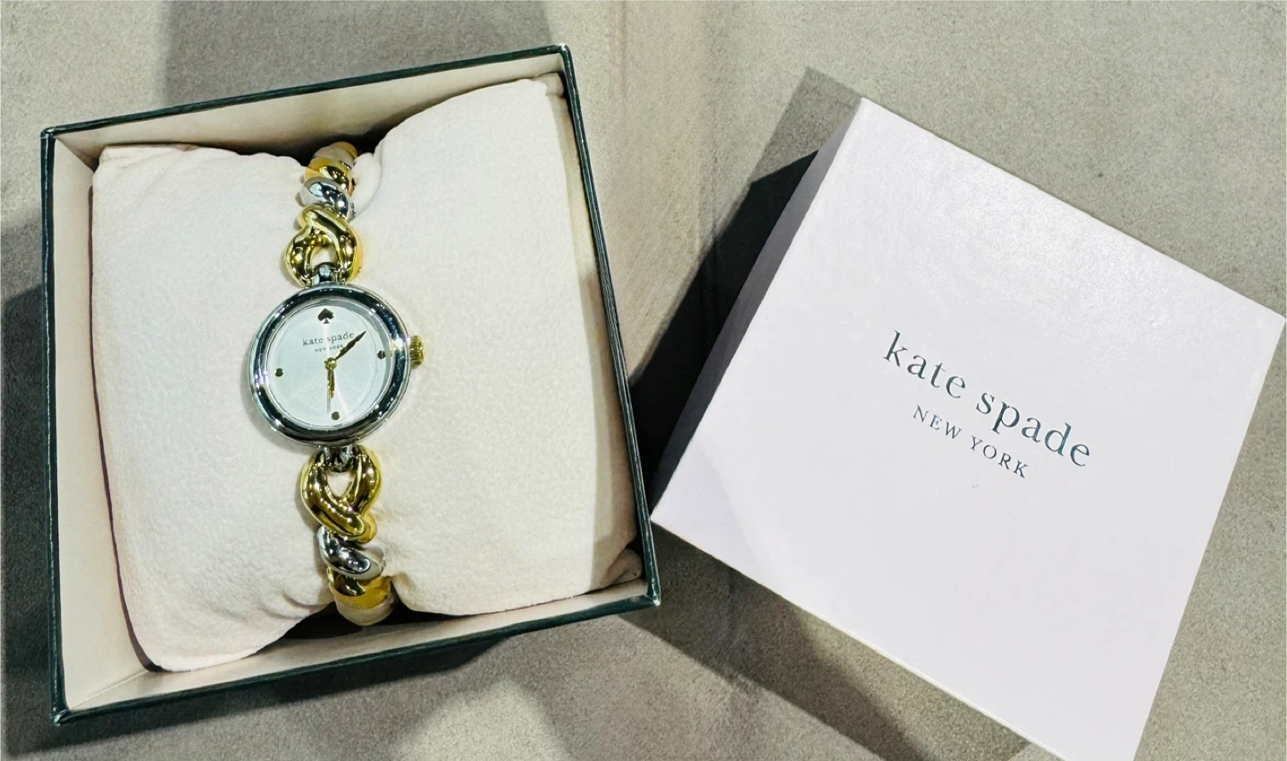 This is a Kate Spade New York women's watch with a two-tone gold and silver link band. It features a white dial with gold-tone hands. The watch comes in its original box.
