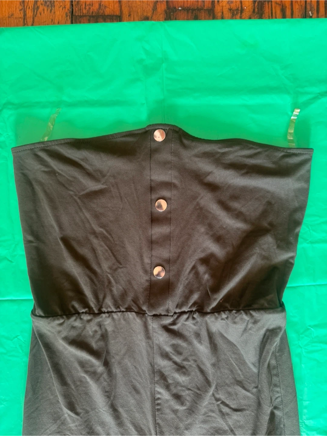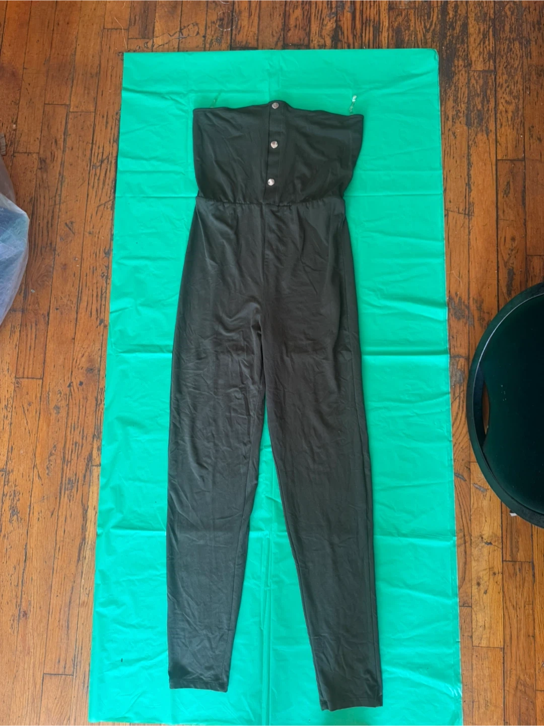 Este mono sin tirantes Heart & Hips es de talla mediana y verde oliva. Está hecho de un material suave y elástico. La sección superior tiene botones decorativos. ¡Perfecto para una ocasión casual o elegante! Llévalo a $7