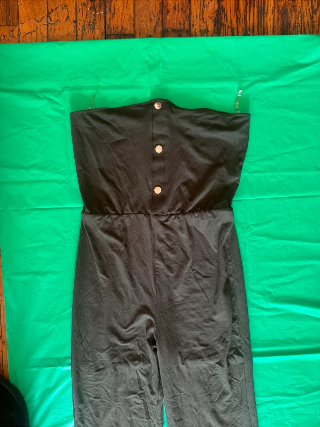 Este mono sin tirantes Heart & Hips es de talla mediana y verde oliva. Está hecho de un material suave y elástico. La sección superior tiene botones decorativos. ¡Perfecto para una ocasión casual o elegante! Llévalo a $7