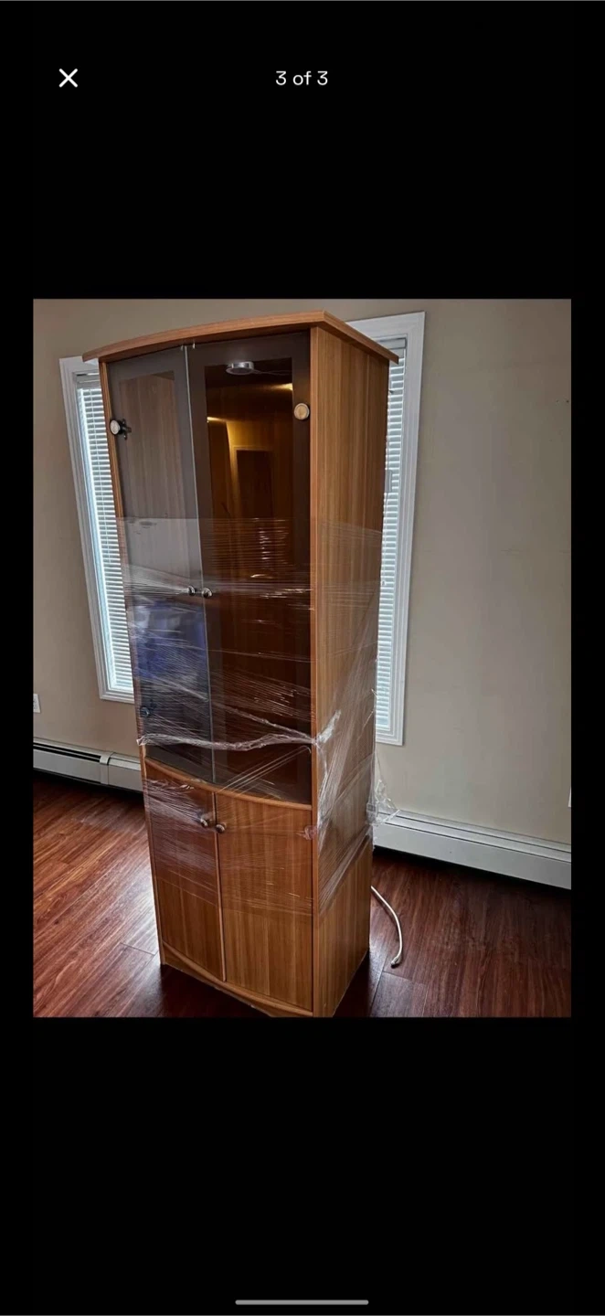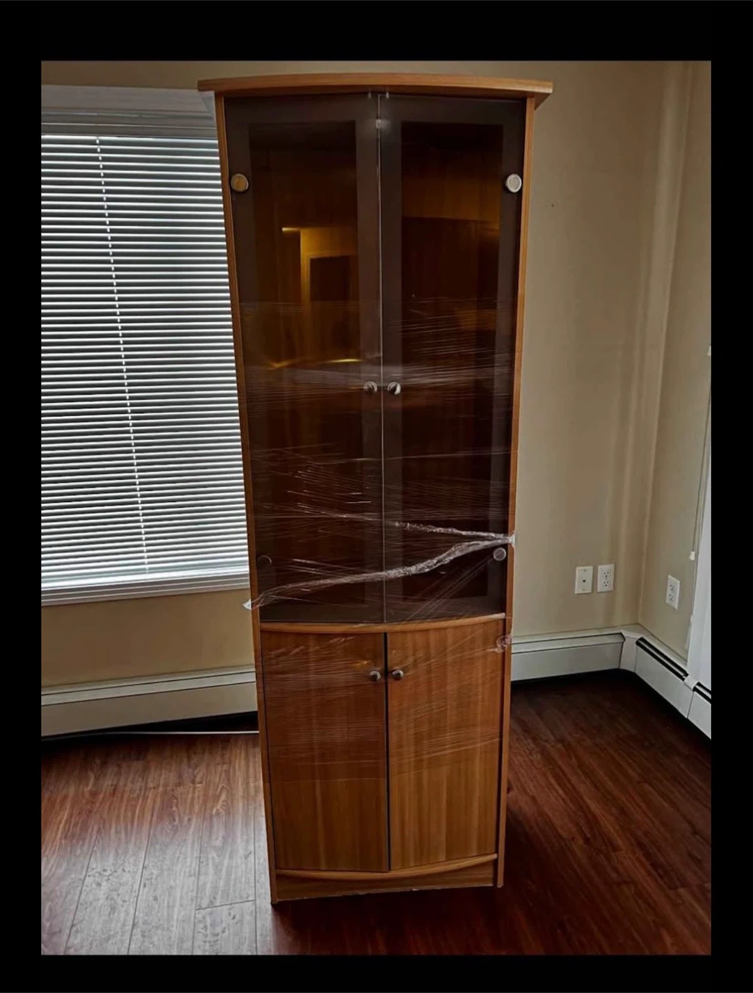 display cabinet with glass doors and wooden base. It's perfect for storing and showcasing collectibles or décor. Features adjustable shelves inside the upper section.