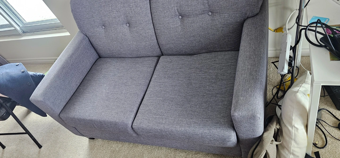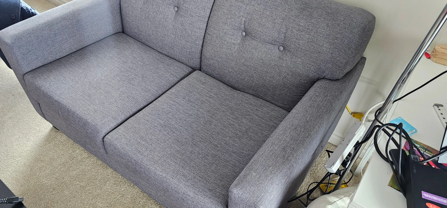 This is a comfy grey two-seater sofa. It's upholstered in a durable fabric with button tufting on the back cushions. Perfect for a smaller living space or a cozy apartment!