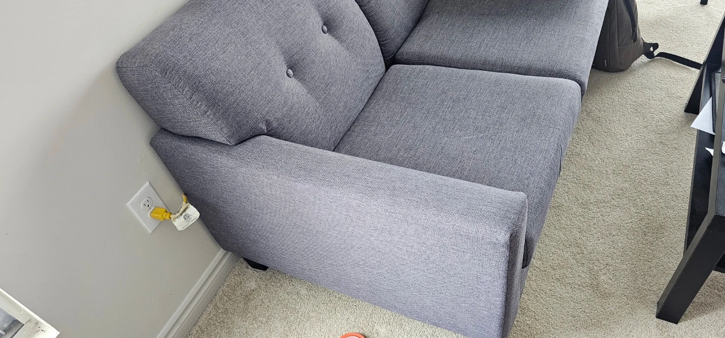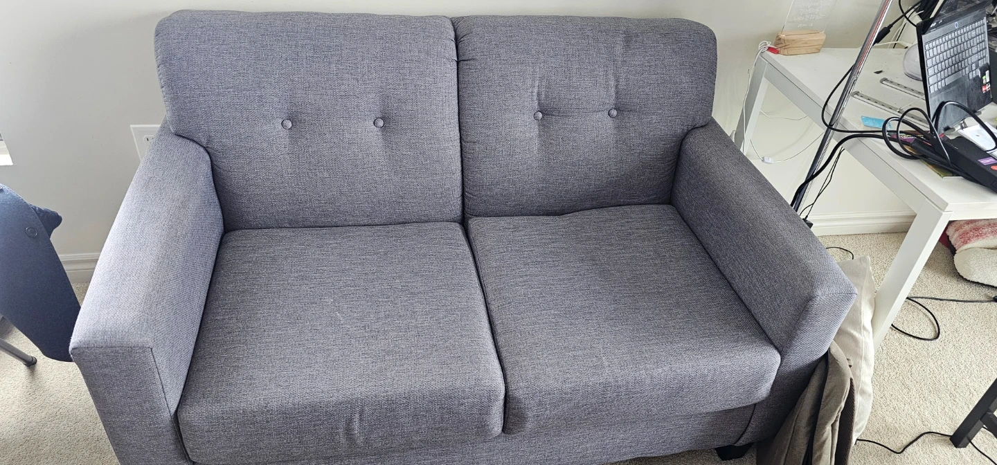 This is a comfy grey two-seater sofa. It's upholstered in a durable fabric with button tufting on the back cushions. Perfect for a smaller living space or a cozy apartment!