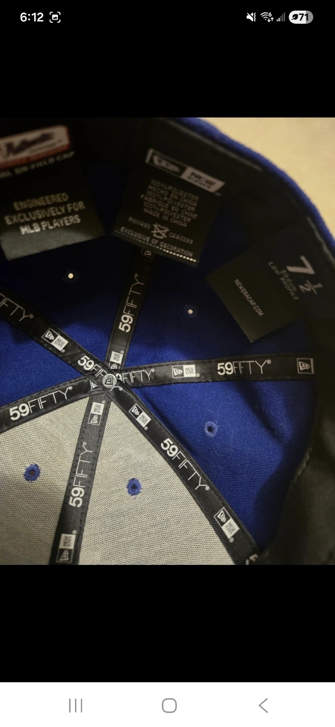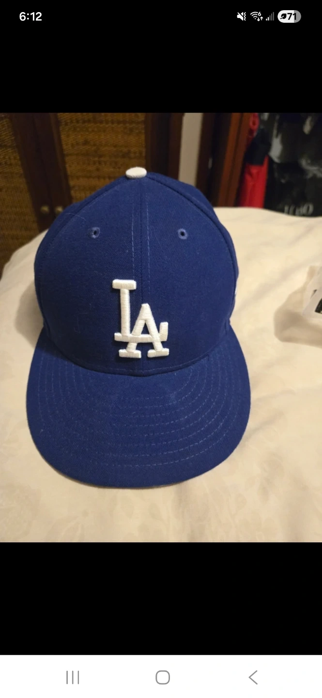 This is a New Era 59FIFTY fitted baseball cap for the LA Dodgers. It's made of 100% polyester. The cap is size 7 1/2. This hat is engineered exclusively for MLB players!