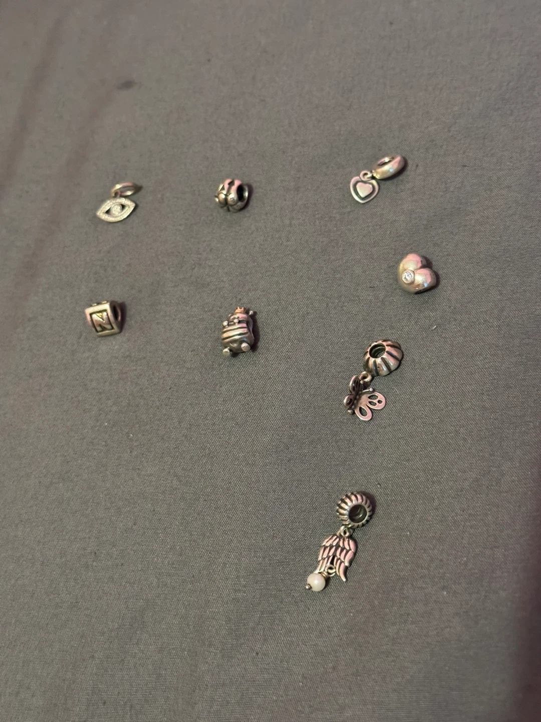 evil eye $45, heart with white stone $50, butterfly $40, angel wings $55, queen bee $55,