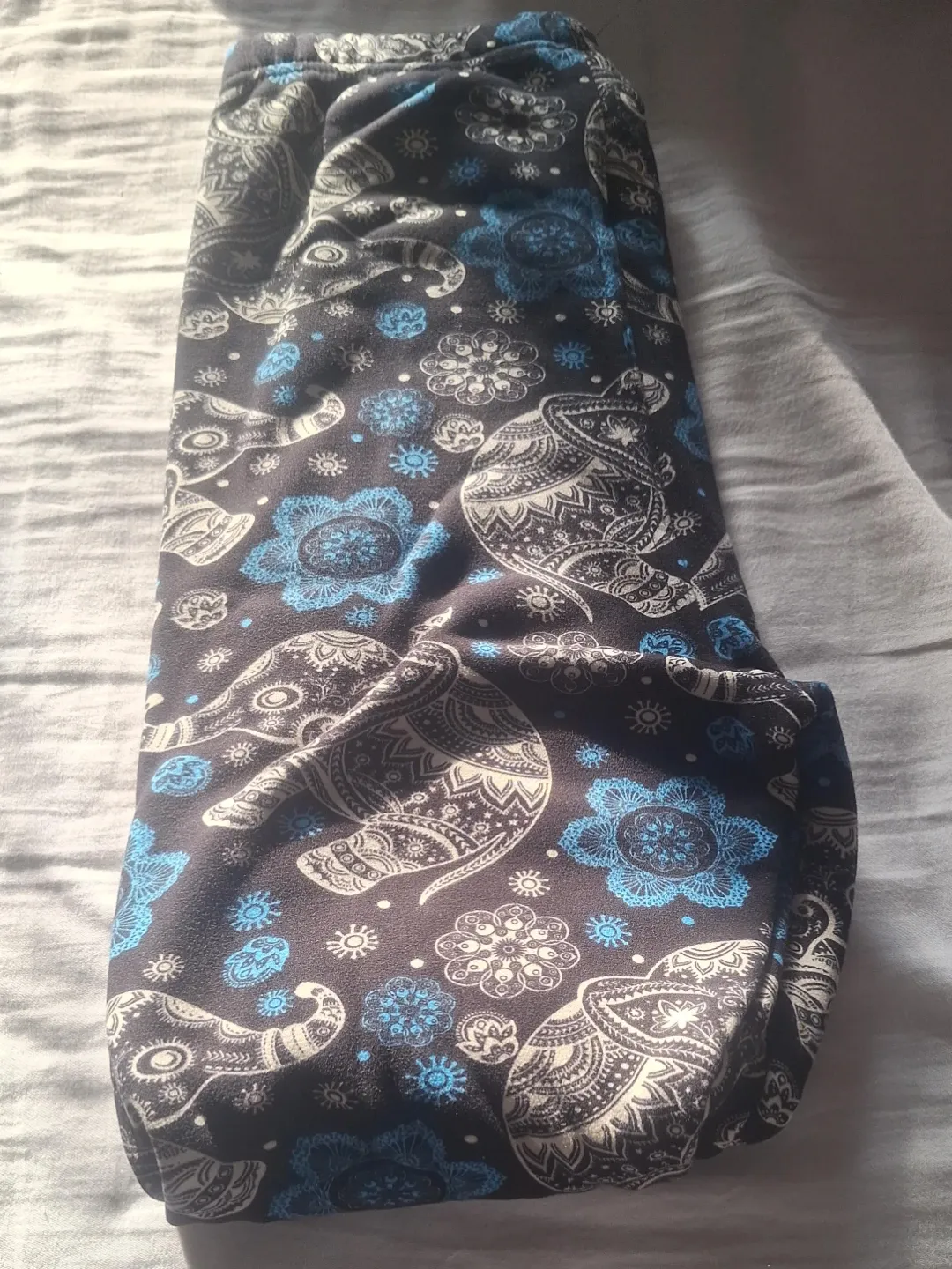 Selling a pair of leggings with a unique pattern! They feature a mix of elephants and floral designs in blue and white on a dark background. Perfect for adding a bit of flair to your wardrobe