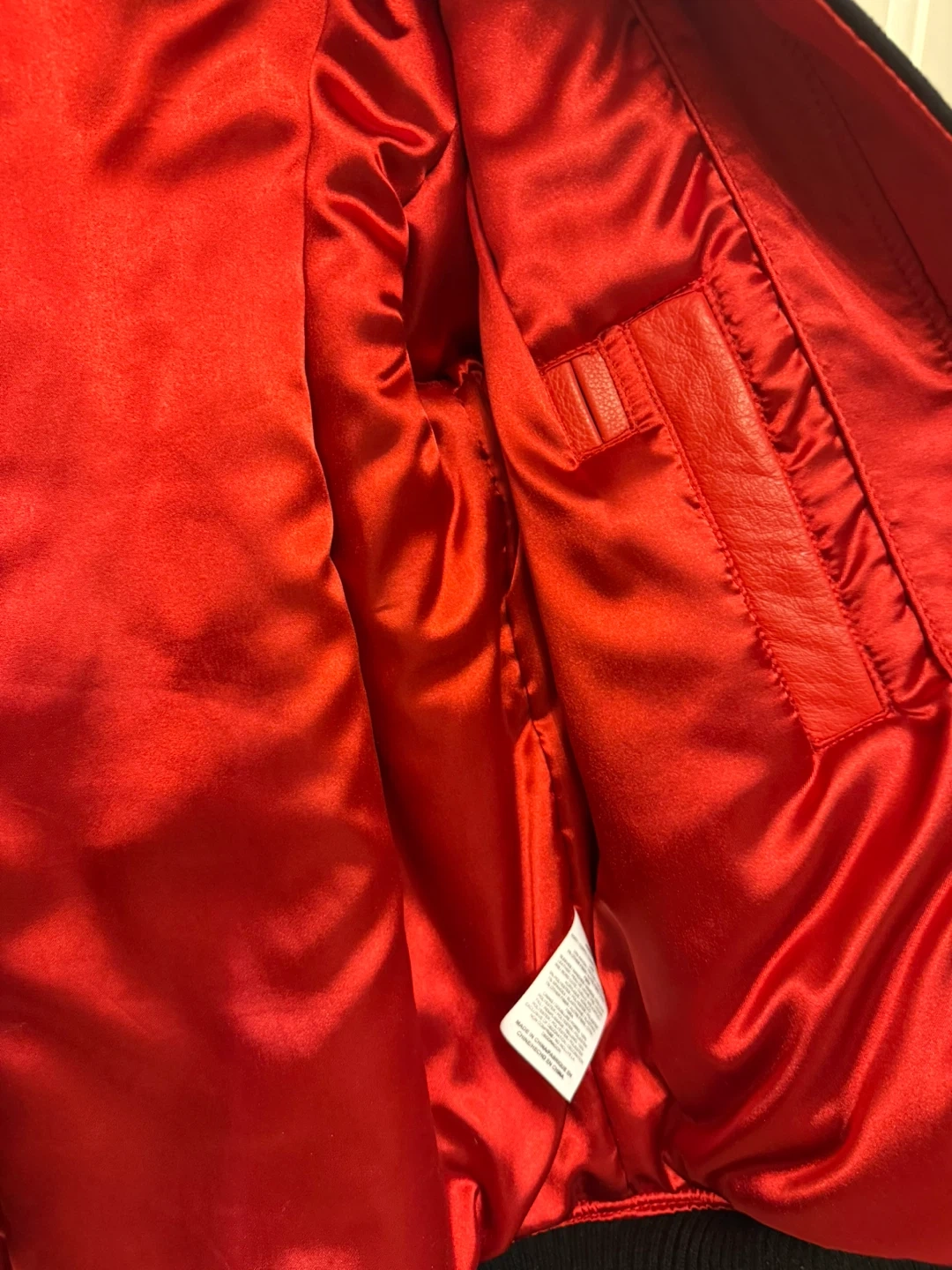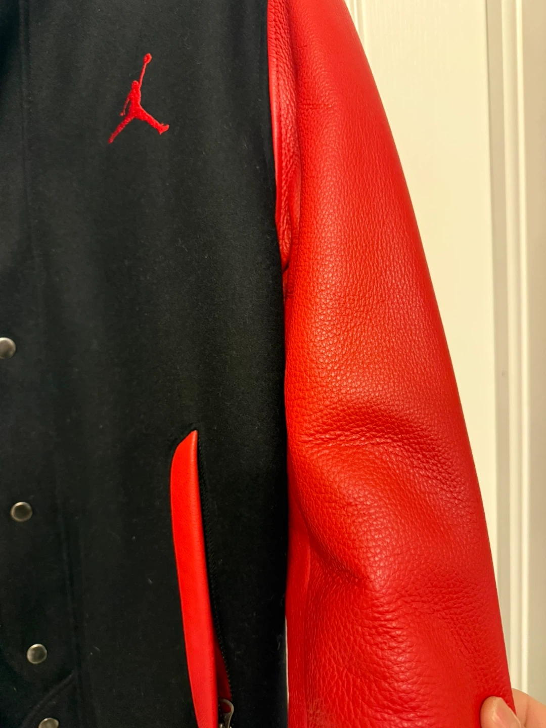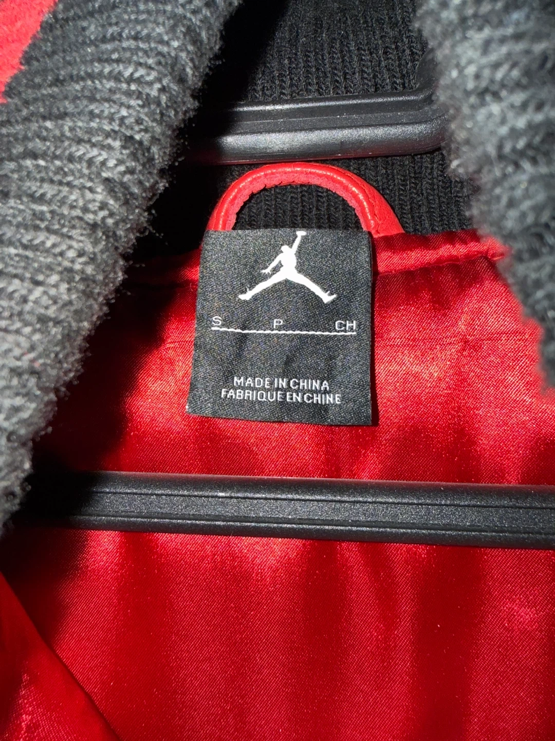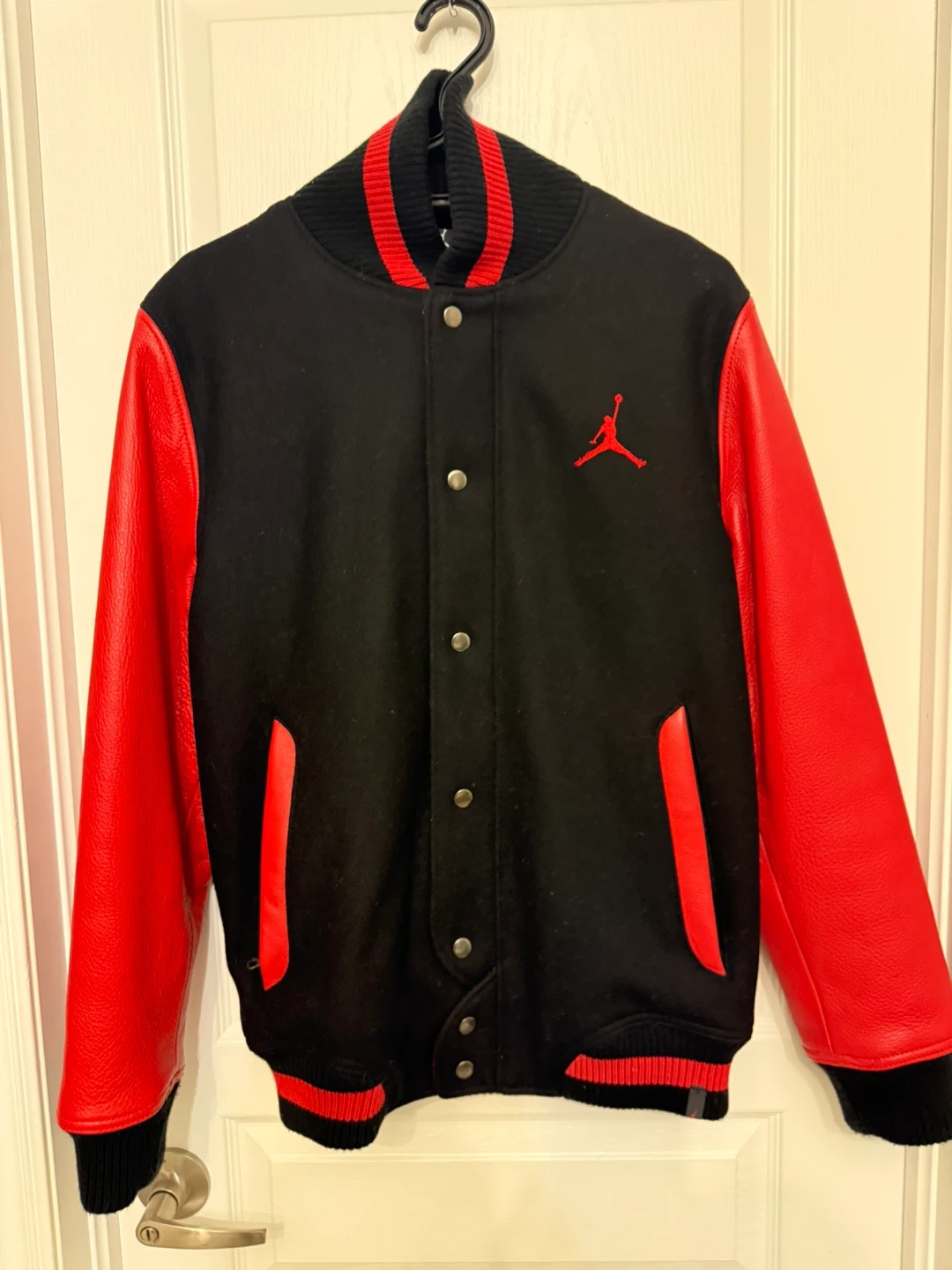 Selling a Jordan varsity jacket in black and red. It's in great condition and features the iconic Jordan logo. The jacket is a size small and has leather sleeves.