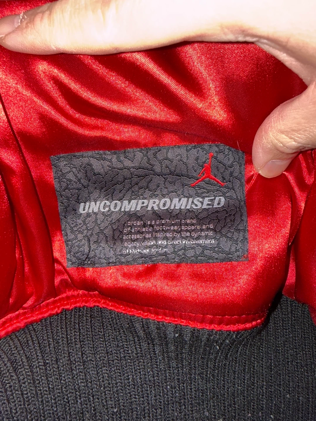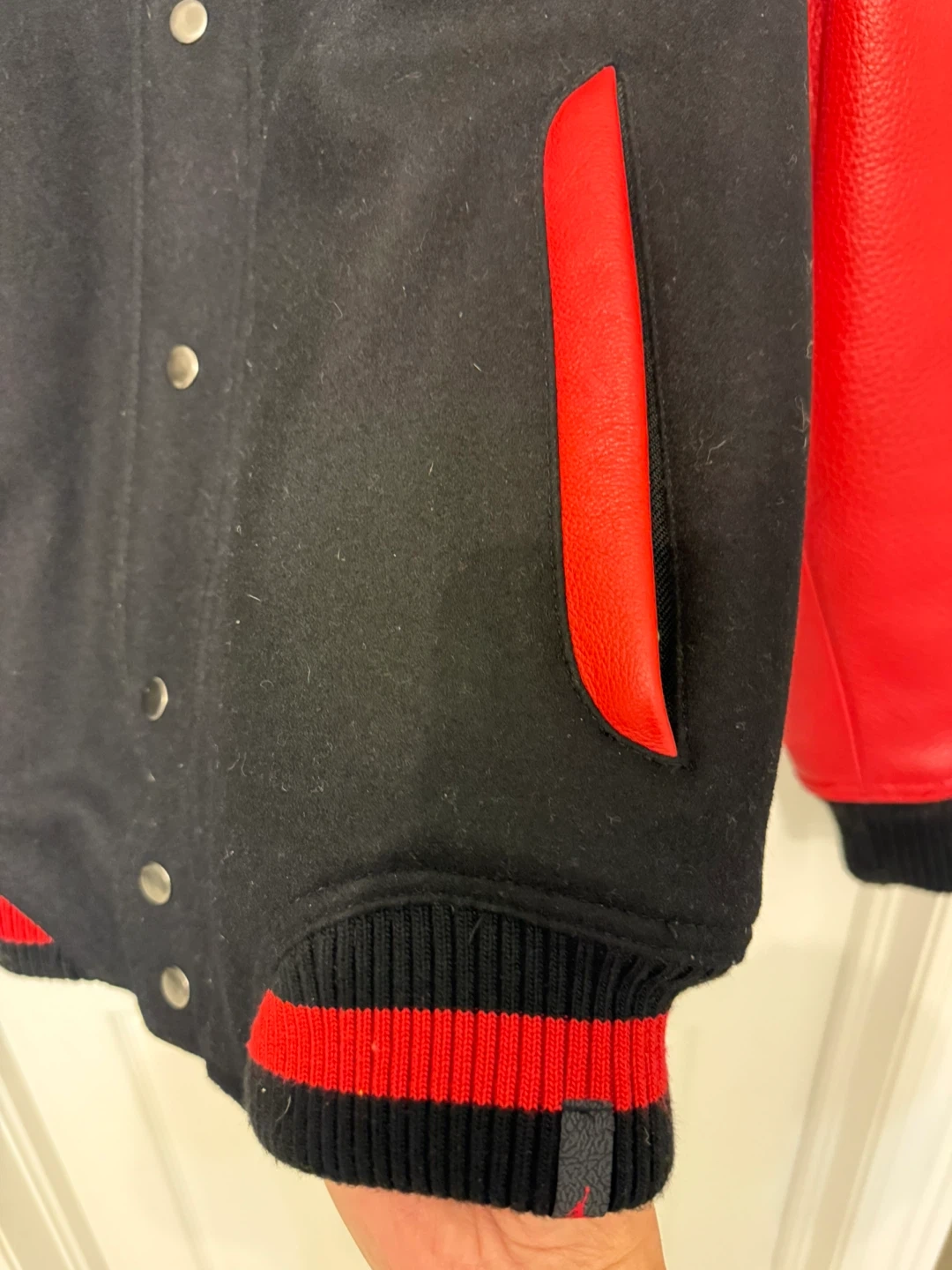 Selling a Jordan varsity jacket in black and red. It's in great condition and features the iconic Jordan logo. The jacket is a size small and has leather sleeves.