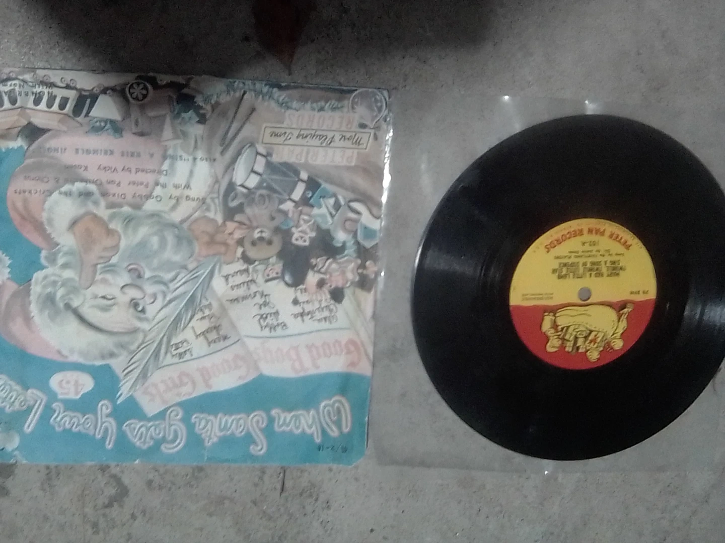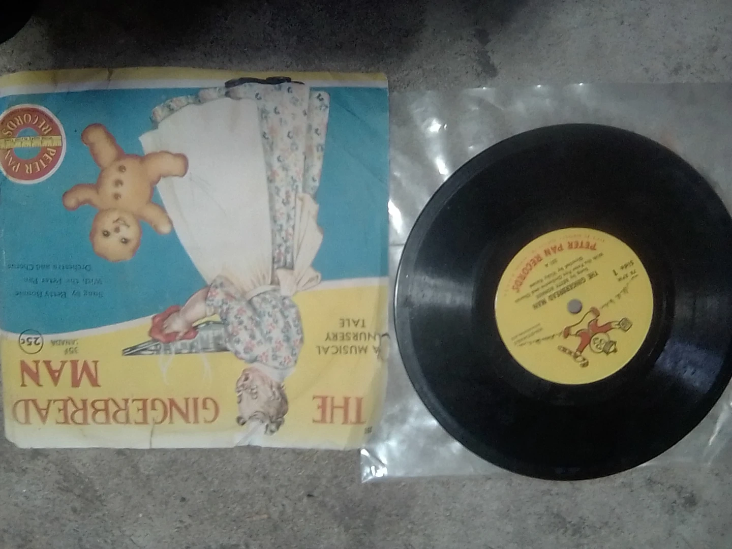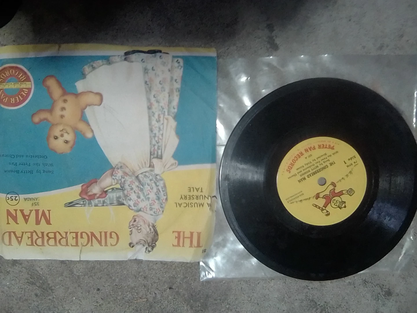 Peter Pan , Gingerbread Man, and Christmas carol vintage 7" disks. All Include original sleeves. Plays at around 45 RPM. Peter pan disk is bent, idk if can unbend. $25 each, $15 for bent one.