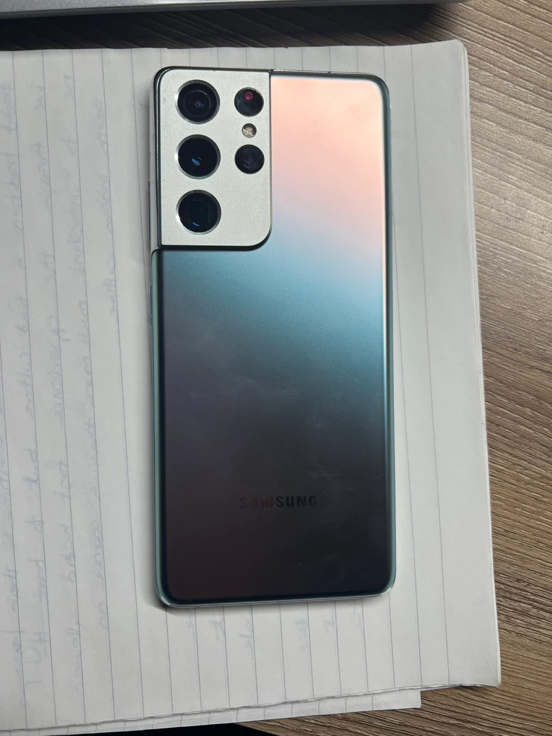 Selling a Samsung Galaxy S21 Ultra. It's a 5G enabled smartphone with a large display and multiple camera lenses. This phone has a sleek, modern design with a colour-shifting back. It's ready for a new owner!