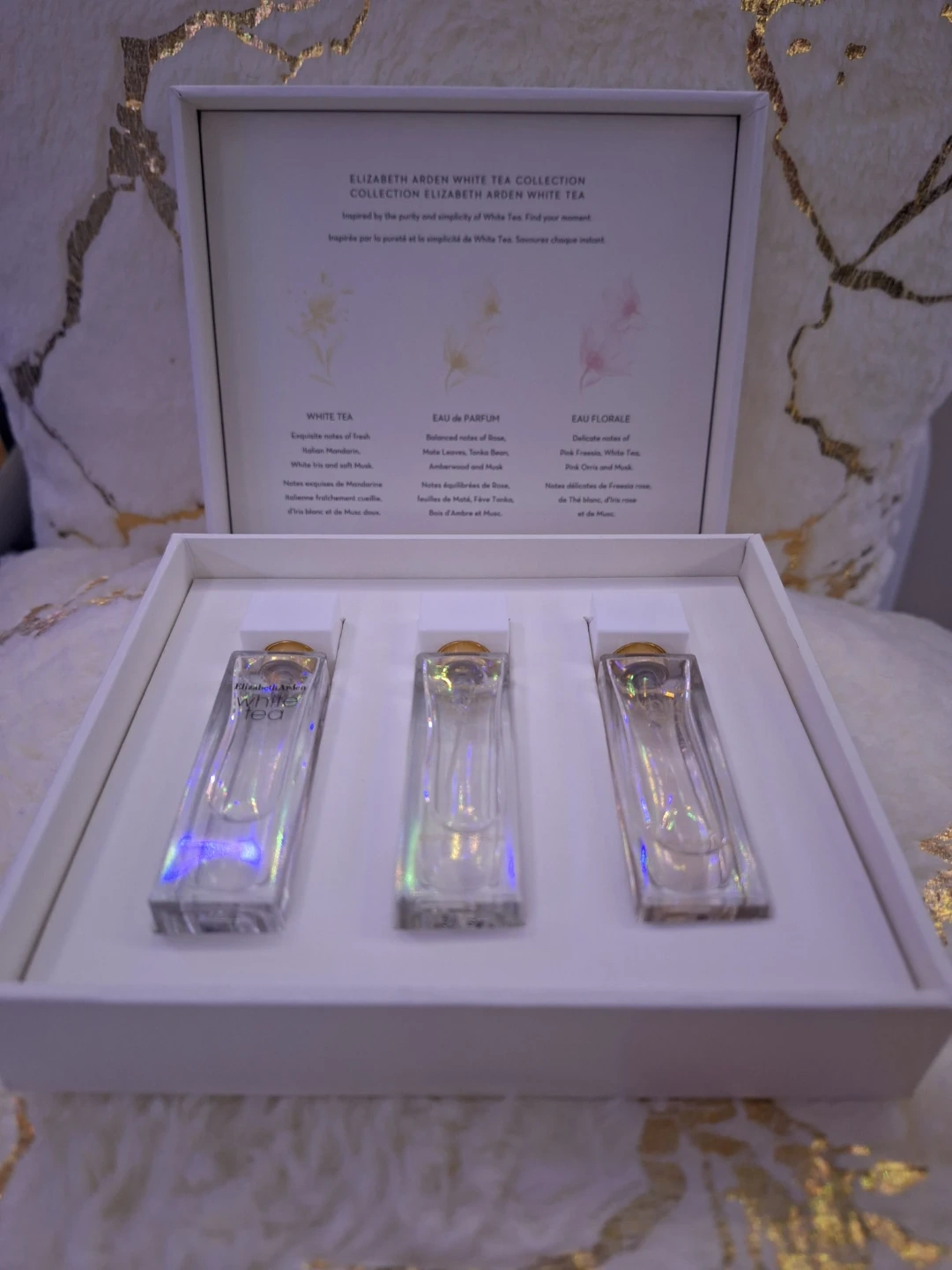 This Elizabeth Arden White Tea fragrance collection features three distinct scents: White Tea, Eau de Parfum, and Eau Florale. Each bottle offers a unique scent profile inspired by white tea. They're perfect for sampling or travel.