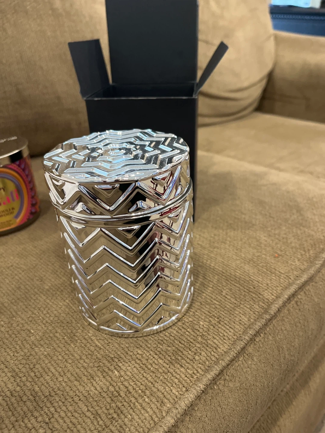 This decorative candle from Flame comes in a shiny silver textured jar with a matching lid. It's a lovely addition to any room. The candle has two wicks.