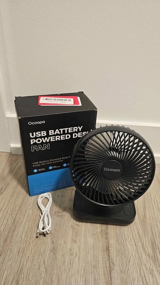This is a portable 5-inch OCOOPA desk fan with a 4000mAh rechargeable battery. It offers 4 speed settings and strong, quiet airflow. The grille is detachable for easy cleaning. It's a mini desktop fan perfect for personal use.