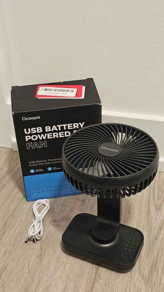 This is a portable 5-inch OCOOPA desk fan with a 4000mAh rechargeable battery. It offers 4 speed settings and strong, quiet airflow. The grille is detachable for easy cleaning. It's a mini desktop fan perfect for personal use.