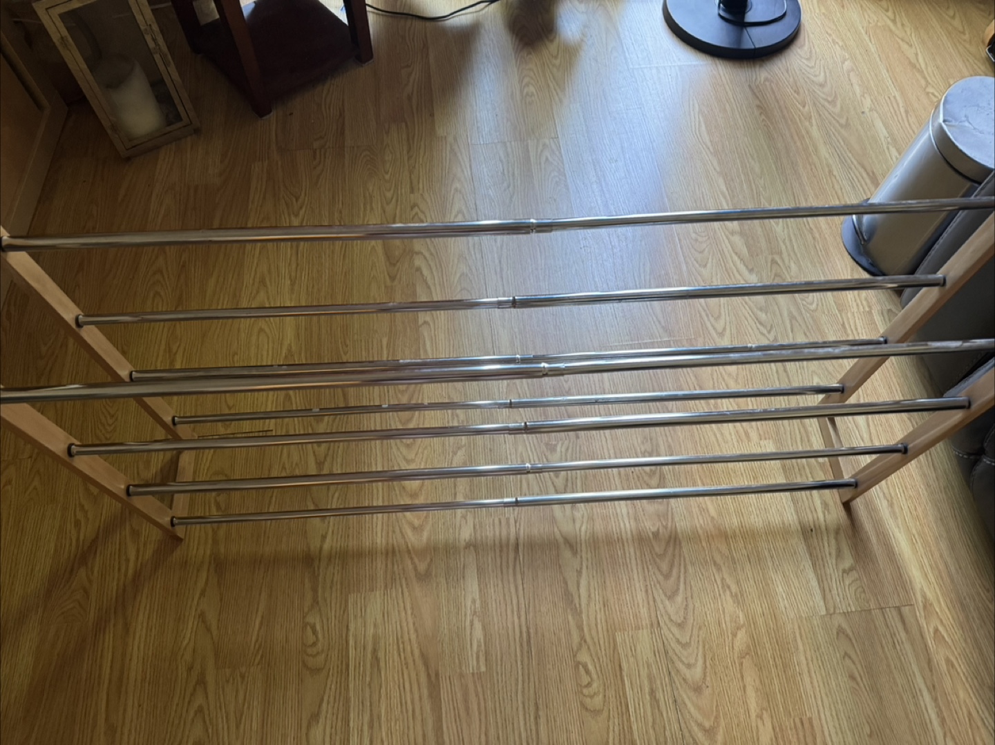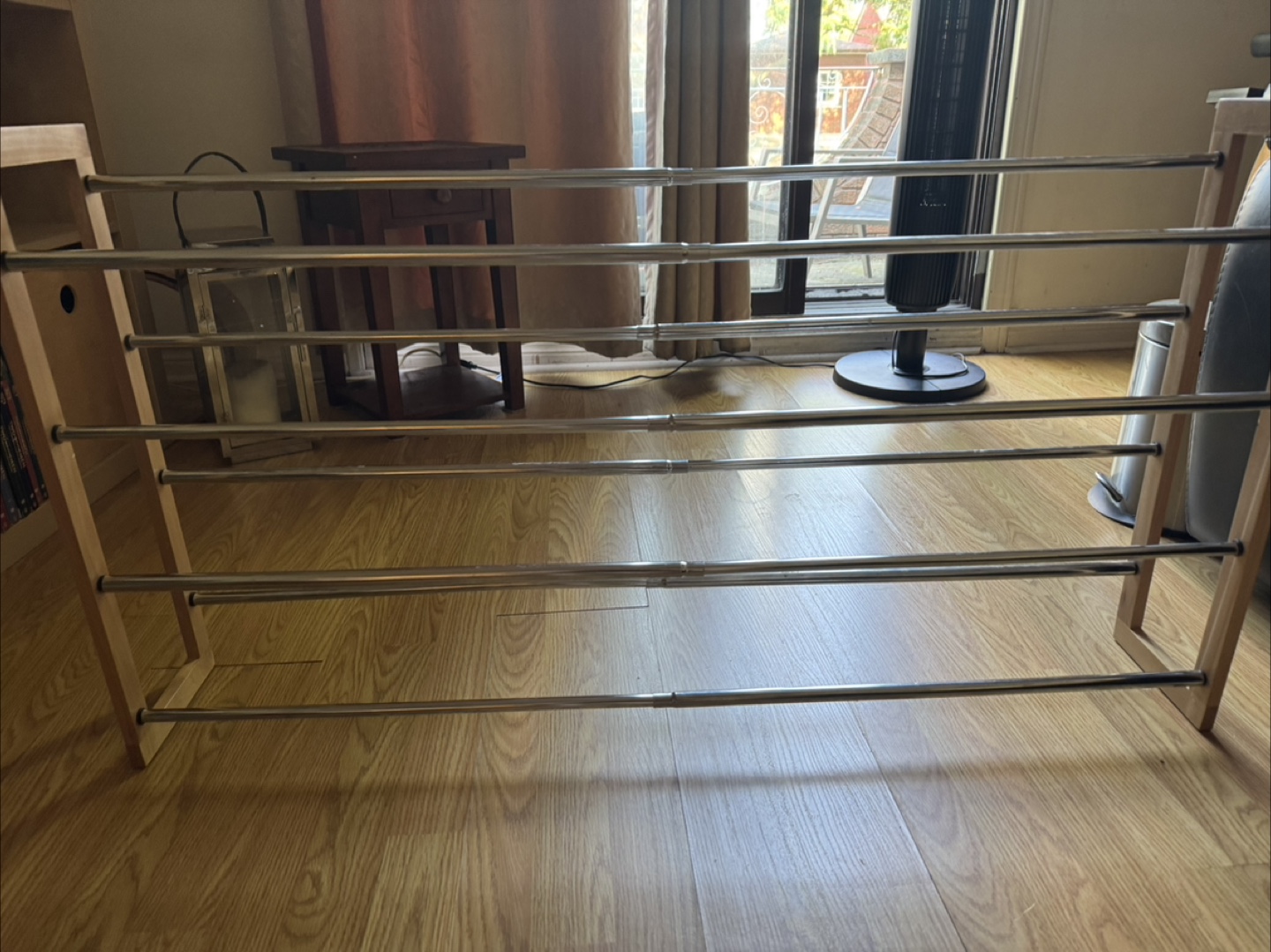 Selling a shoe rack in good condition. It's perfect for organizing your shoes and keeping them off the floor. It's a simple, functional design that fits well in any entryway or closet
