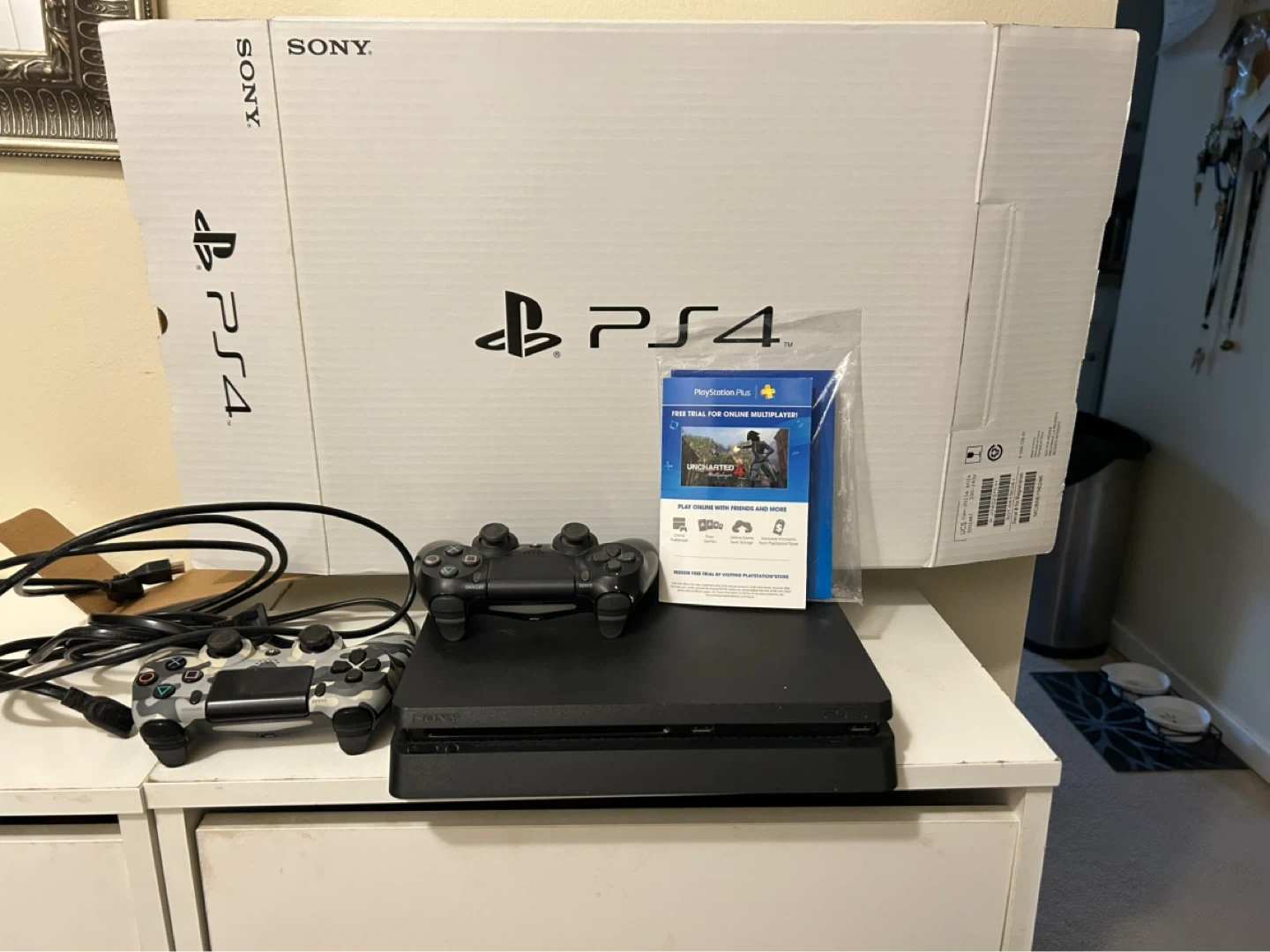 Sony PlayStation 4 console with original box. Includes one black DualShock 4 controller and one grey camouflage controller. Also comes with a PlayStation Plus free trial voucher. Great for gaming with friends! 500