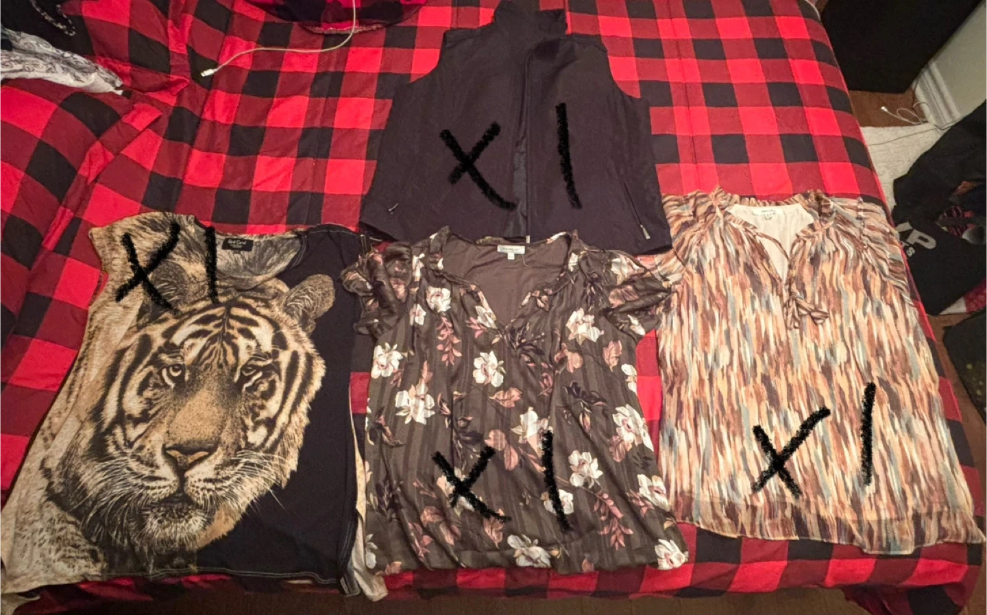 Selling a mixed lot of women's tops. There's a tiger print top, a floral top, a striped top, and a vest. All in excellent condition!