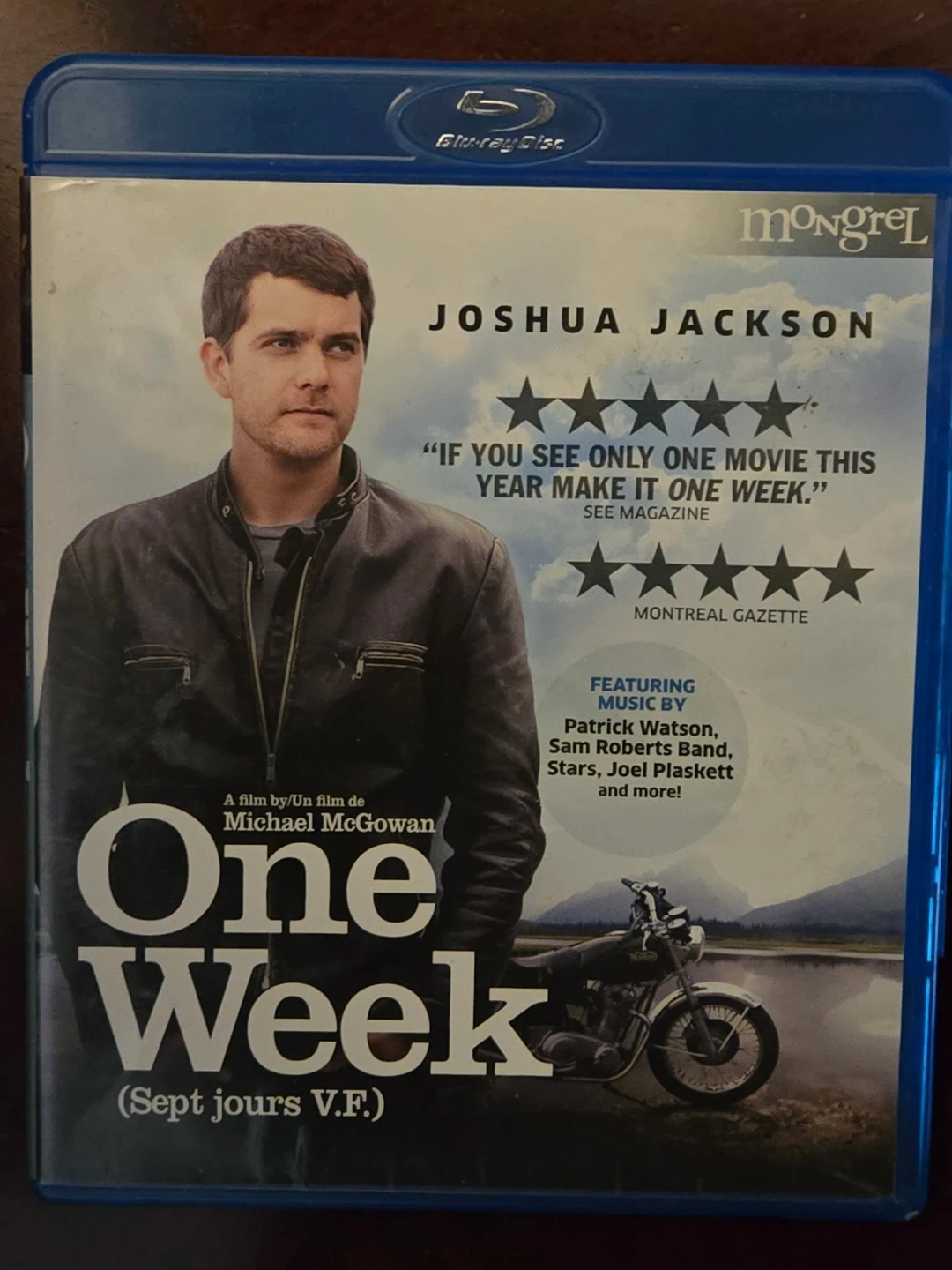 This is the Blu-ray disc for the movie One Week, starring Joshua Jackson. It features music by Patrick Watson, Sam Roberts Band, and more. It's a film by Michael McGowan.
