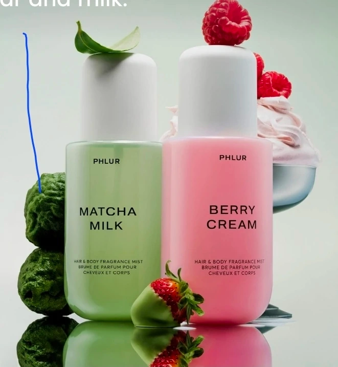 PHLUR Berry Matcha Latte Hair & Body Mist Duo. Includes Matcha Milk and Berry Cream scents. Two 8.1 Fl. Oz. bottles for a total of 240 mL. These mists are for hair and body.