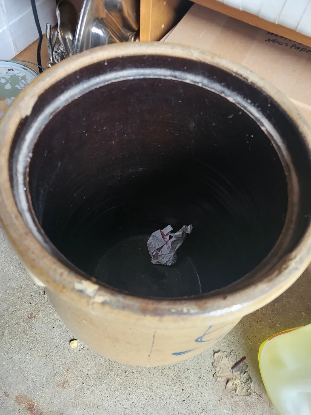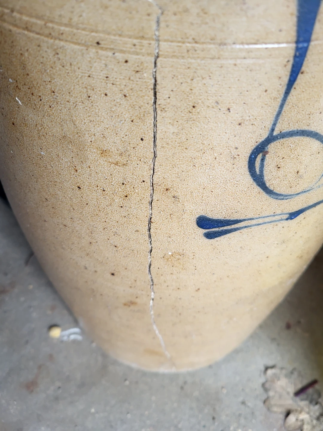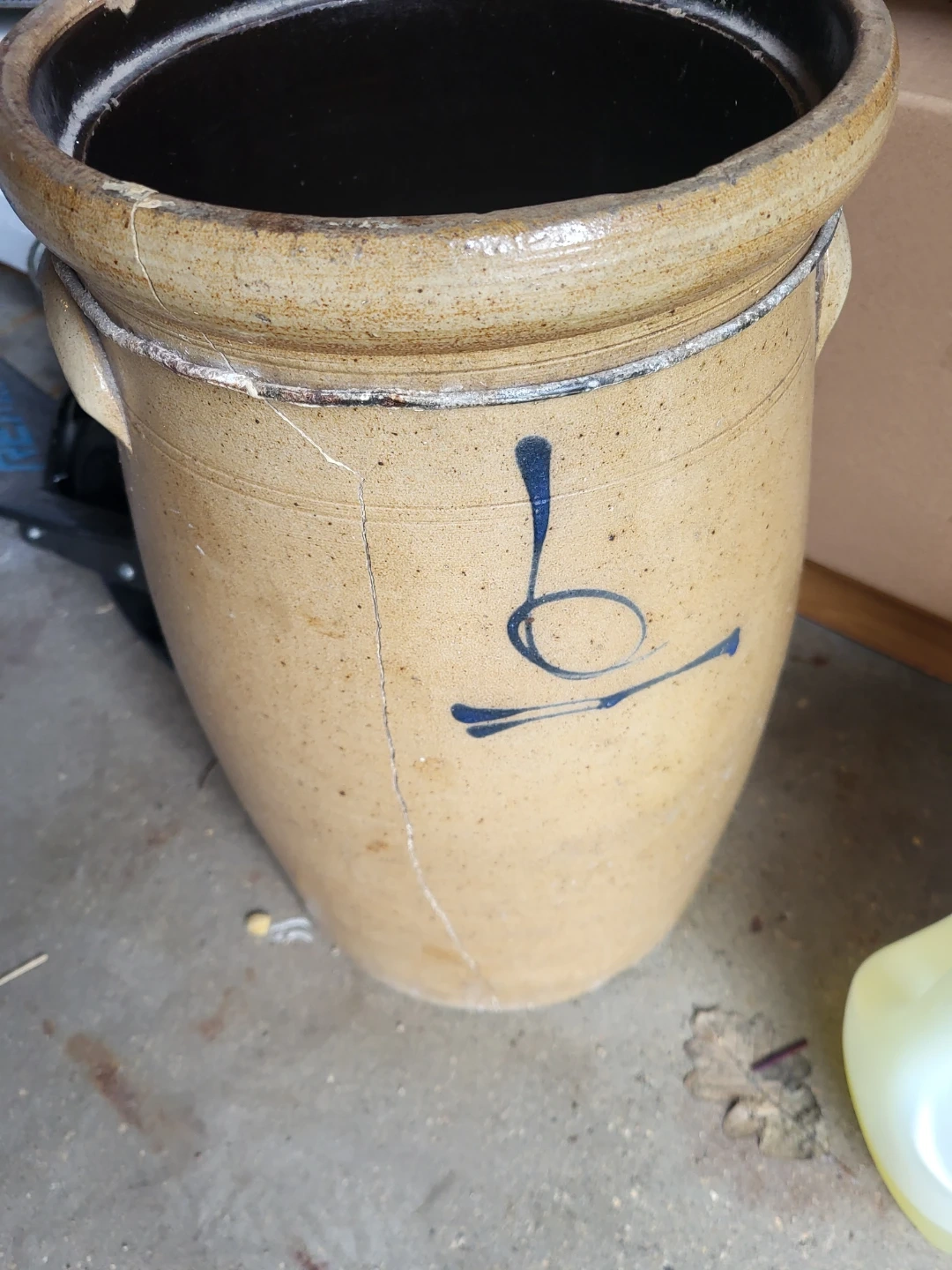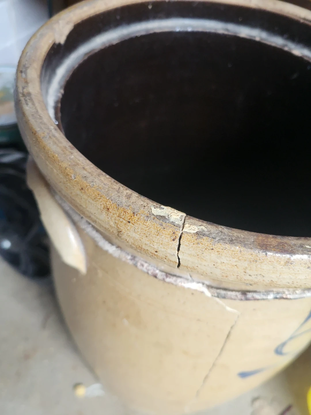 This is a vintage stoneware crock with blue decoration. It has handles and a dark brown interior. There are cracks visible on the exterior.