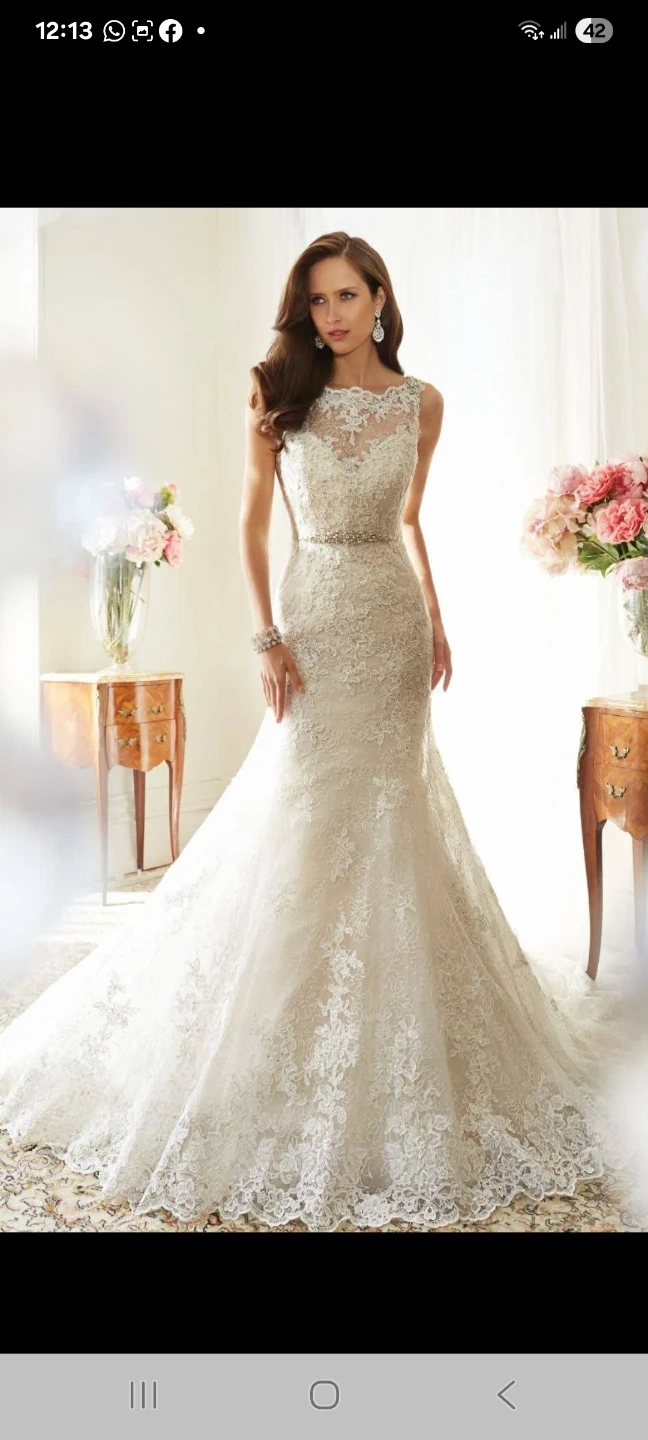 Stunning white lace wedding dress with a delicate beaded belt. It features an illusion neckline and a mermaid silhouette. Lace material with intricate floral details throughout.