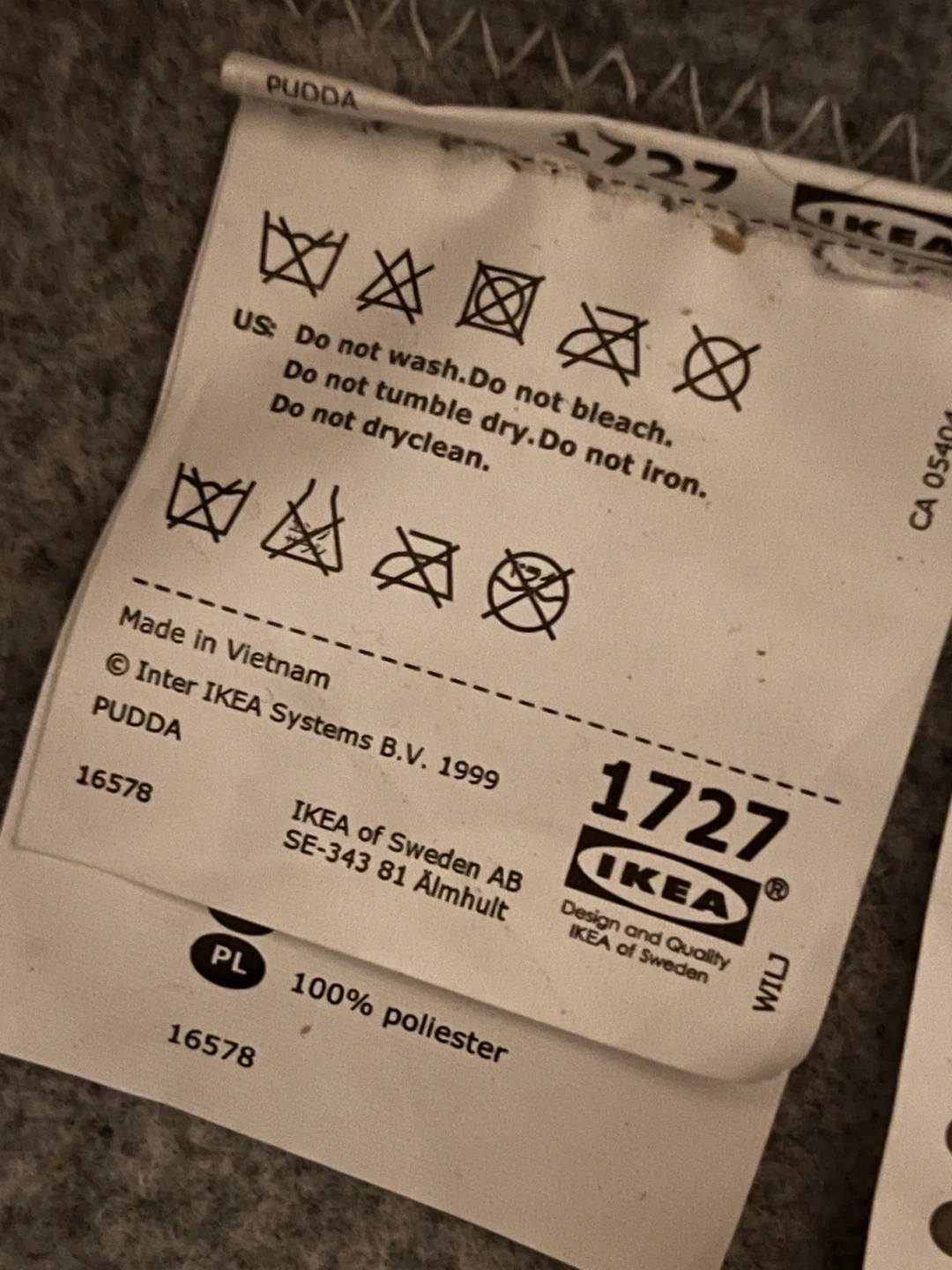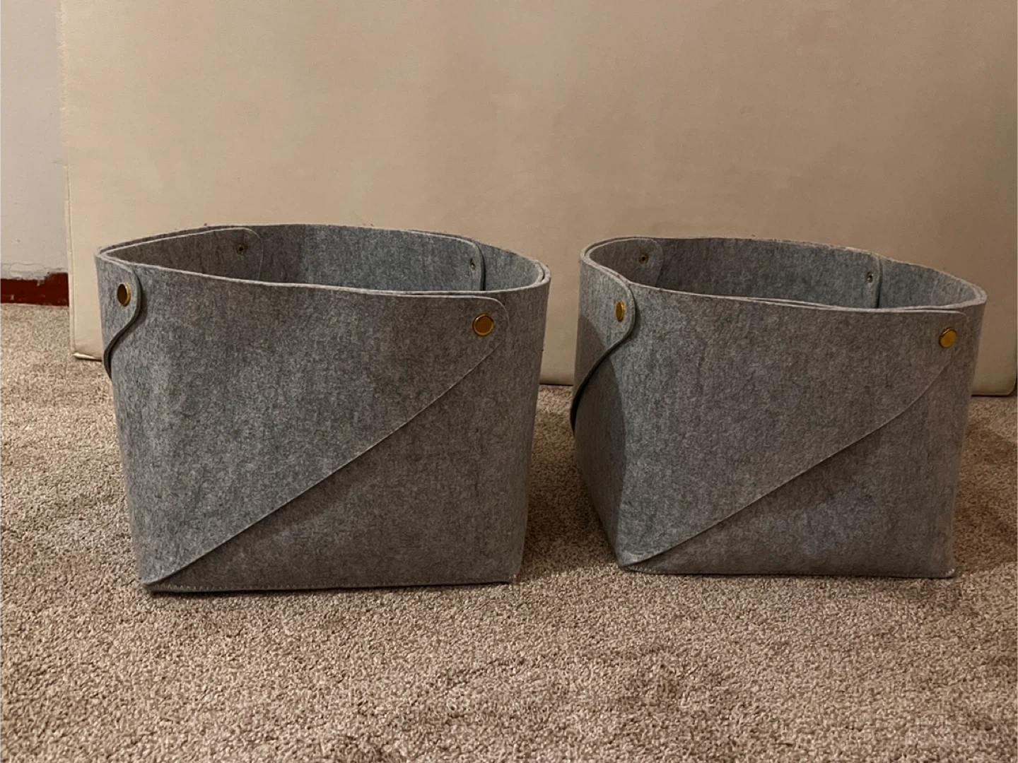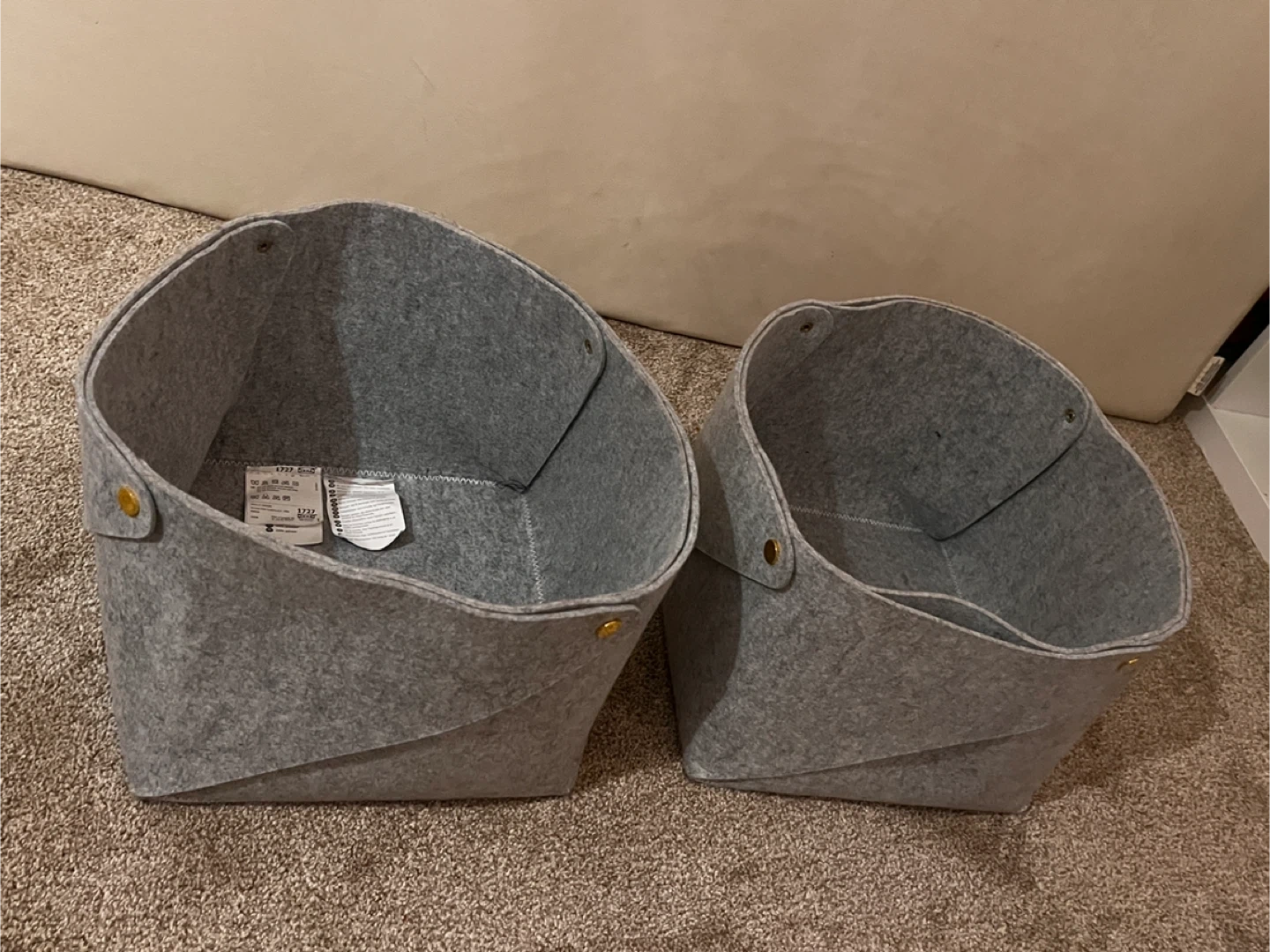 Two grey felt storage baskets by IKEA, called Pudda. Made from 100% polyester. They're great for organizing small items around the house. Do not wash or tumble dry.