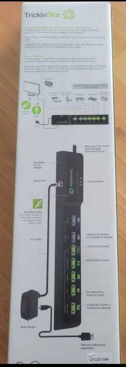 This is a new TrickleStar 7 AV Advanced PowerStrip+, designed to save energy and protect your electronics with advanced surge protection. It features 7 outlets and is ideal for home entertainment systems. Key features include: 7 surge-protected outlets, Advanced energy-saving technology, Fireproof MOV surge protection, Child safety covers. This power strip is a great way to manage your power consumption and keep your devices safe from power surges. Let me know if you're interested!