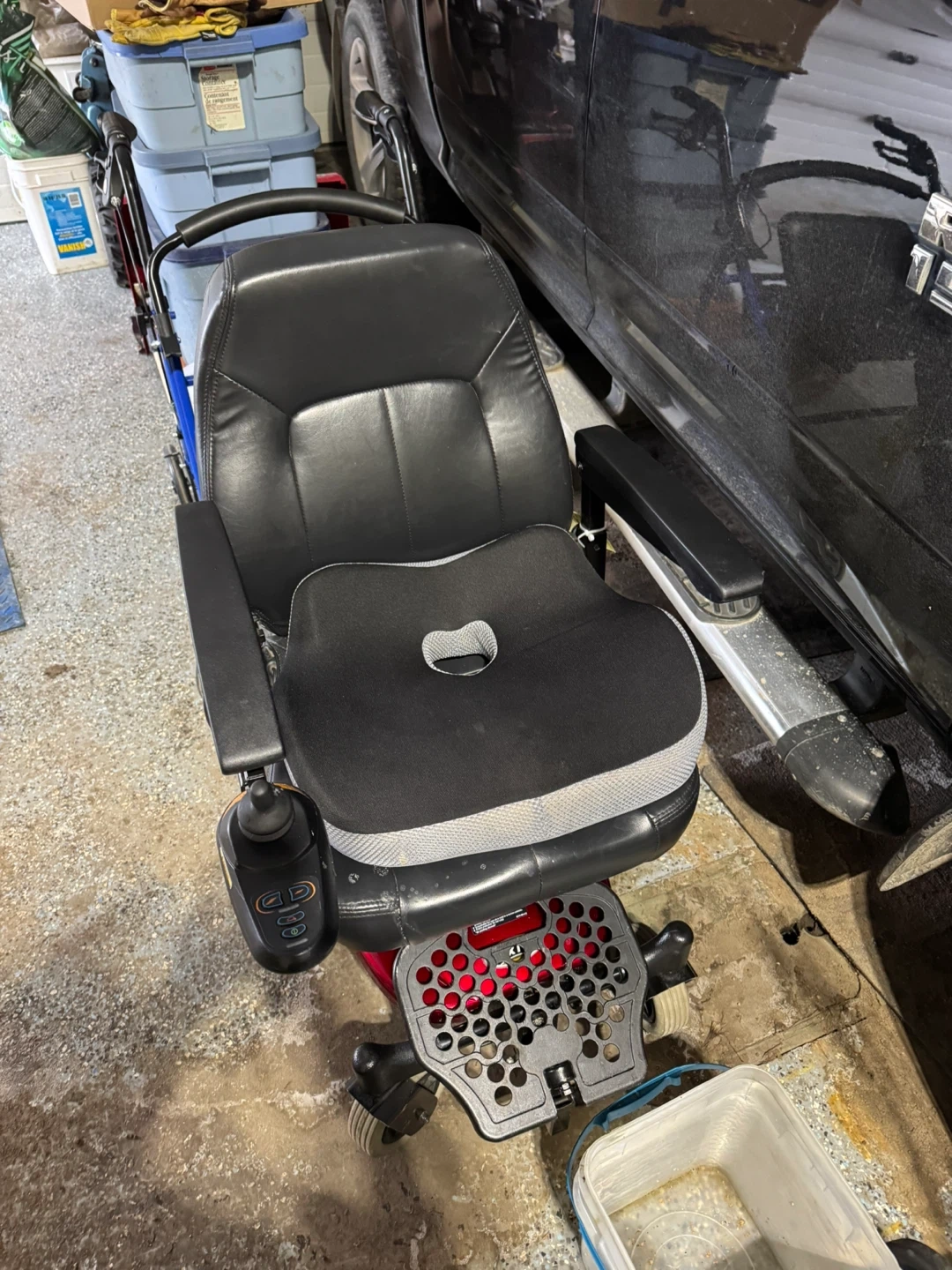 Used Shop rider axis power wheelchair with black leather upholstery. It features adjustable armrests and a joystick controller. This chair is red and black.