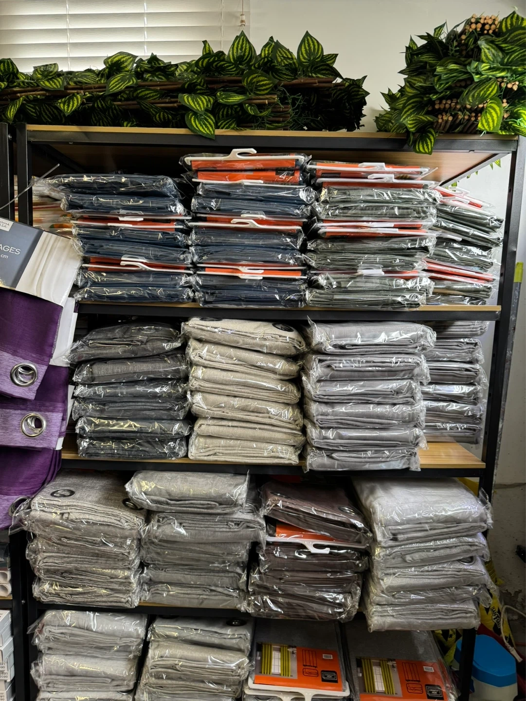 Multiple stacks of blackout curtains in various neutral and dark colours. They appear to be made of polyester fabric. Each package includes 1 panel.