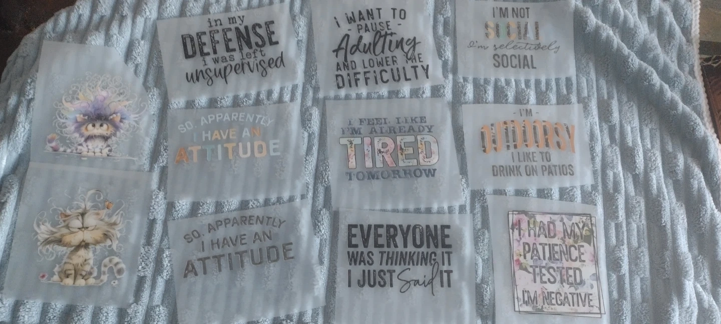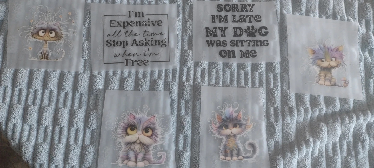 $3 Each . Lot of 11 assorted heat transfer vinyl appliques featuring whimsical cats and humorous quotes. These are perfect for adding a unique touch to t-shirts, tote bags, or other fabric items. Apply with a heat press or iron for a fun, personalized look! I am Asking $3 each
