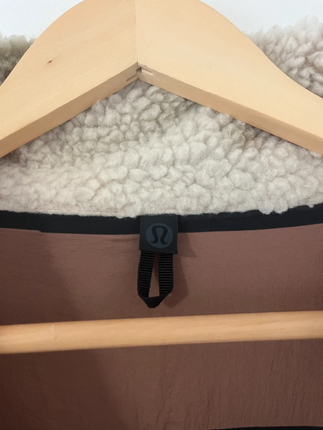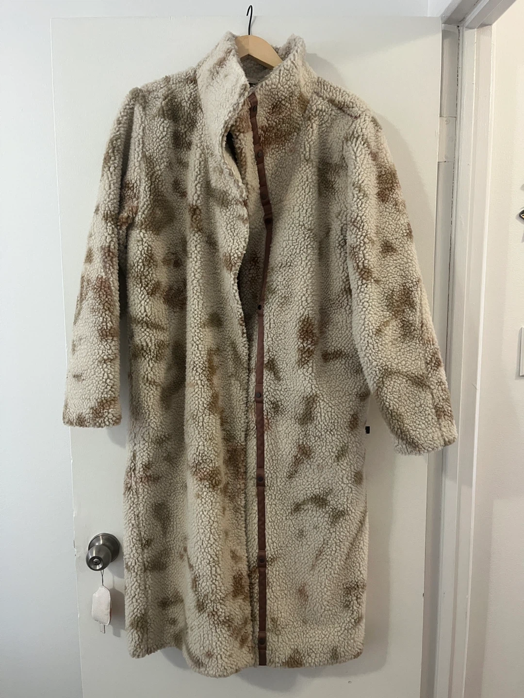 Cream and brown sherpa coat with a tie-dye pattern. It's a long, cosy jacket with a high neck. Made from a soft fleece material.