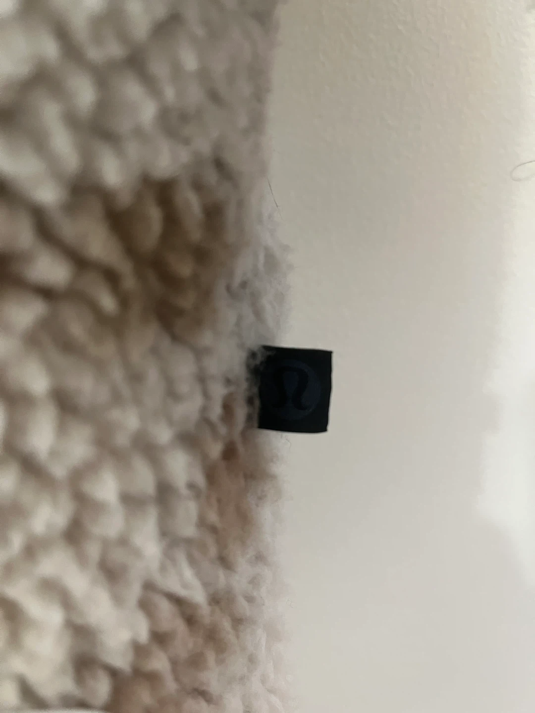 Cream and brown sherpa coat with a tie-dye pattern. It's a long, cosy jacket with a high neck. Made from a soft fleece material.
