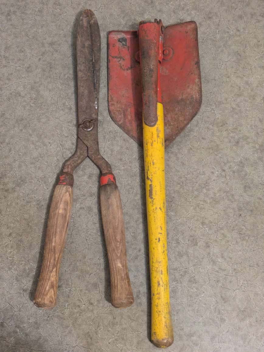 vintage gardening tools. Includes a pair of hedge shears with wooden handles and a rusty shovel with a yellow painted handle. Show signs of age and wear. Great for a collector or someone looking for rustic charm.