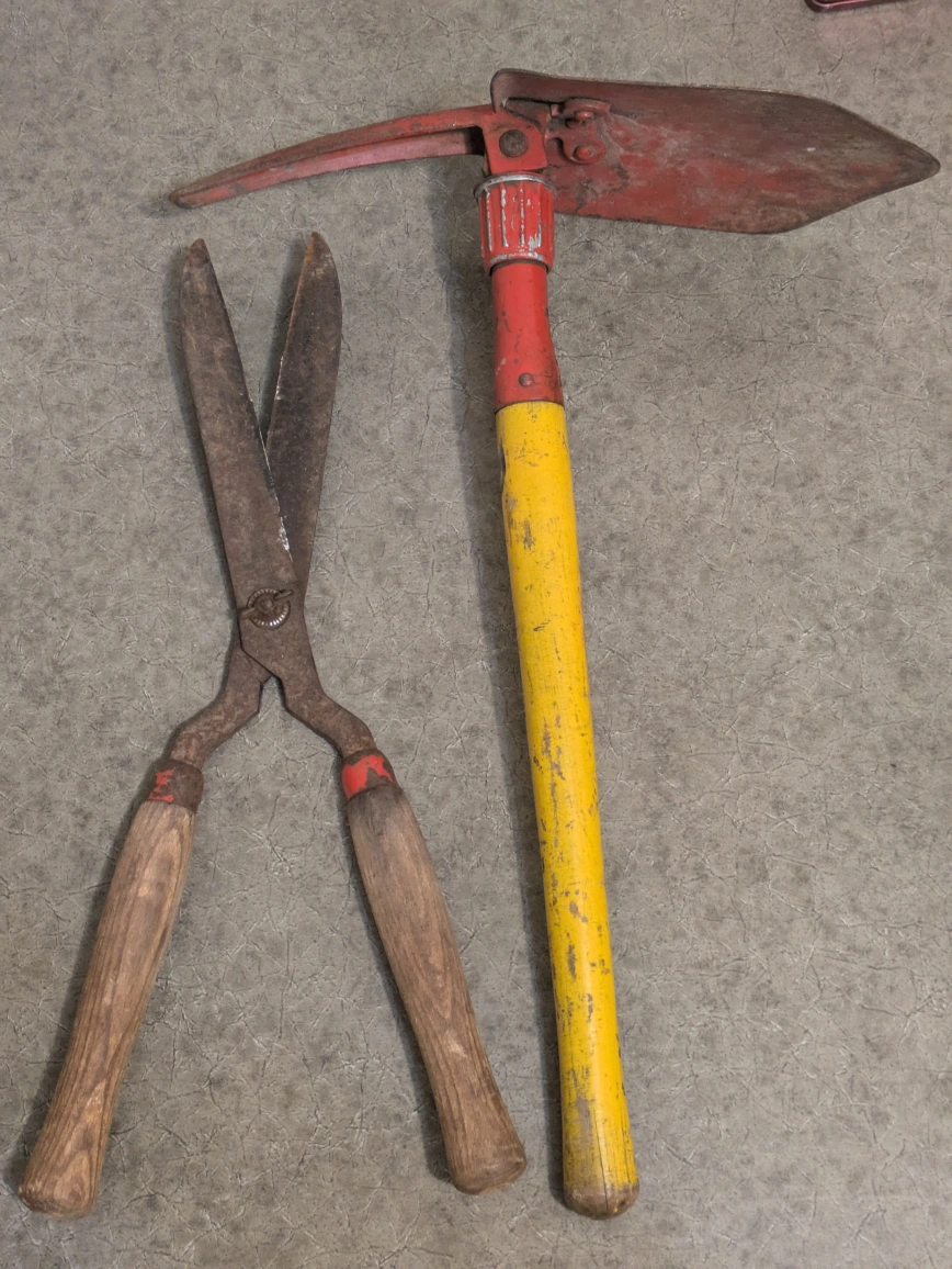 vintage gardening tools. Includes a pair of hedge shears with wooden handles and a rusty shovel with a yellow painted handle. Show signs of age and wear. Great for a collector or someone looking for rustic charm.