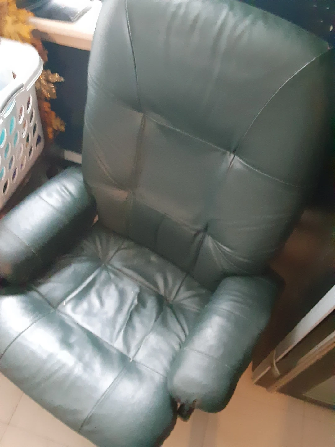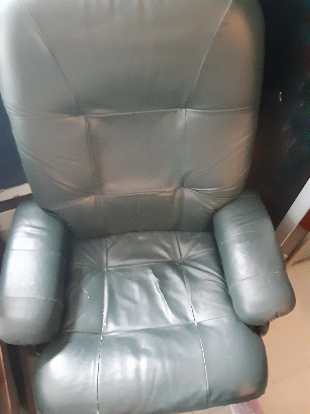 Comfortable recliner chair in a dark green colour. It's upholstered in what appears to be faux leather. The chair has a plush design with padded arms and backrest. Great for relaxing!