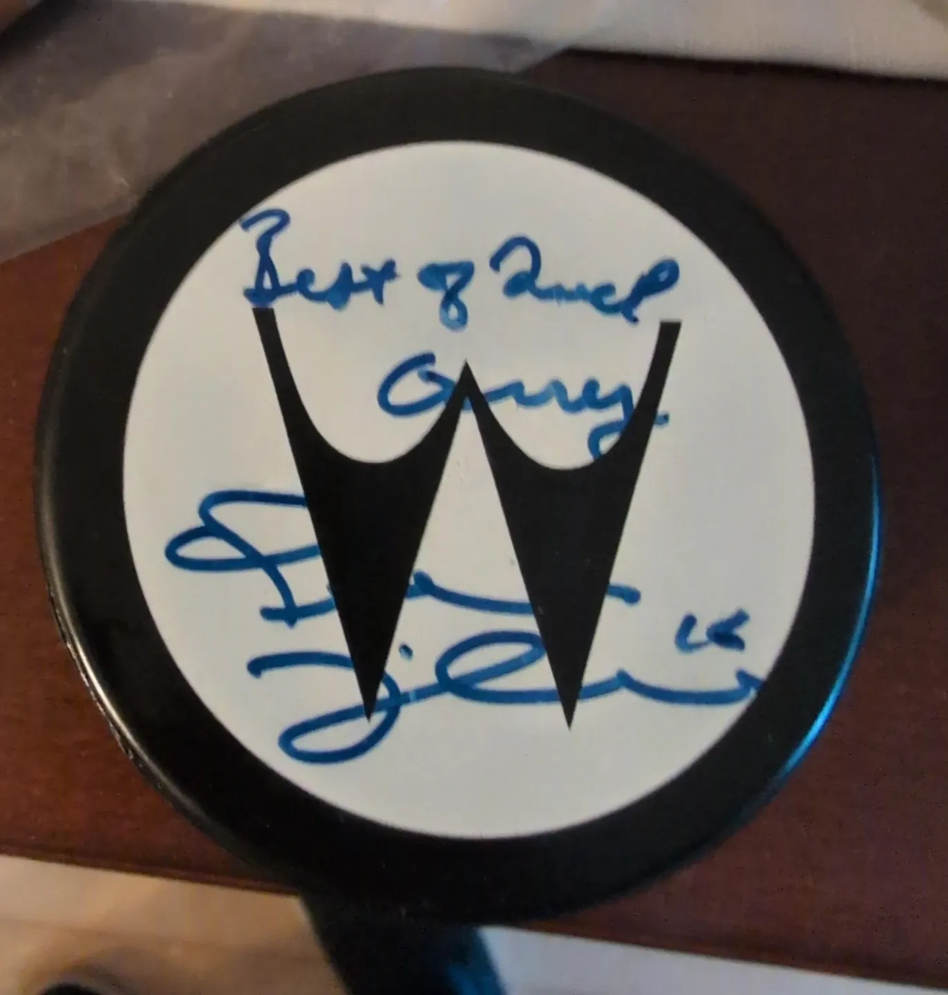 Signed hockey puck. Features a white centre with blue marker. Text reads 'Best of Luckl' and includes Trevor Linden's signature. This is a great collectible item for any hockey fan! It is from about 25 years ago or so, when I golfed with him at an event in Surrey.