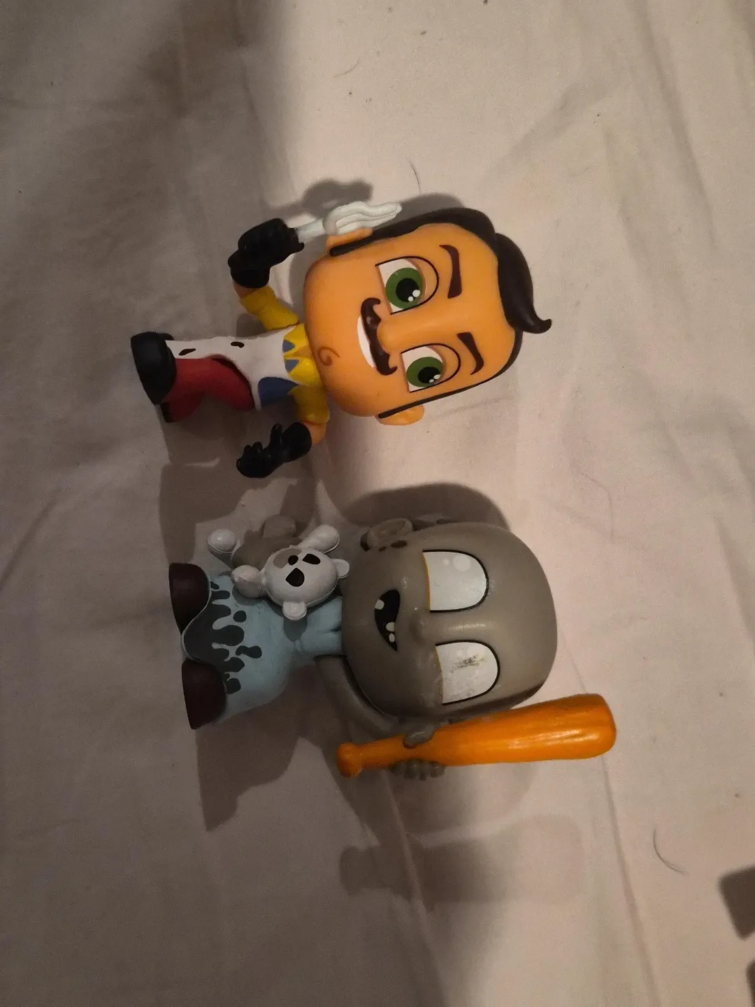 Two vinyl figures from the Hello Neighbor game. One figure is of Mr. Peterson and the other appears to be from the game Granny. Good for any collector